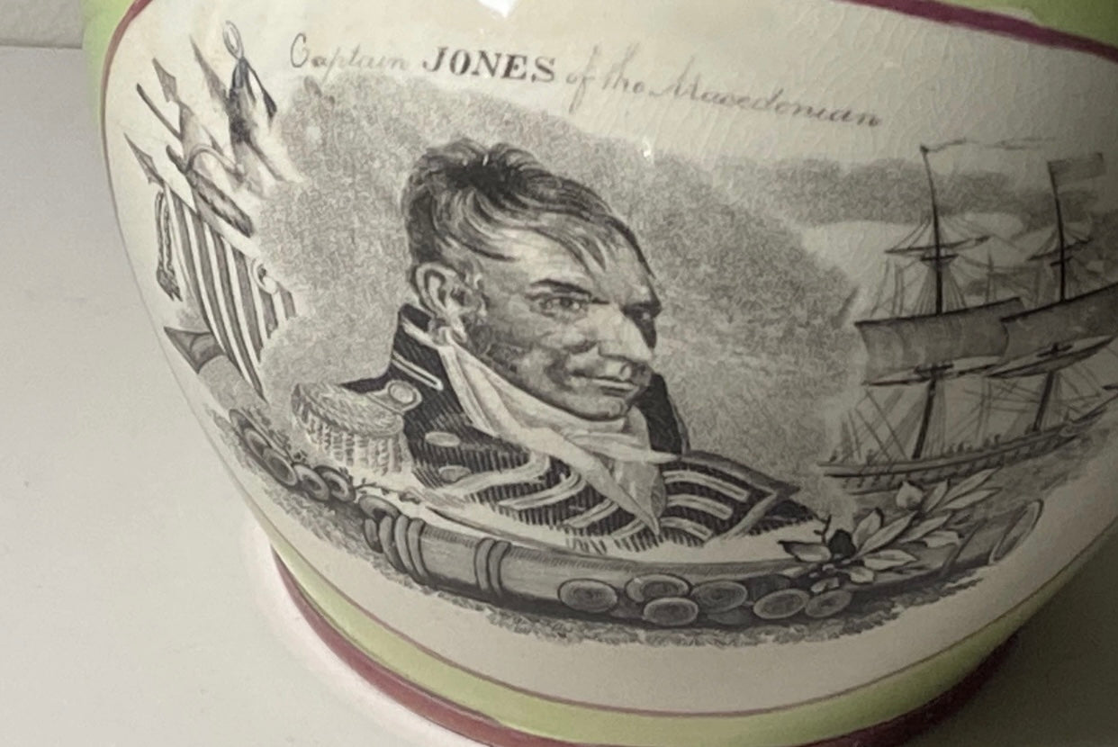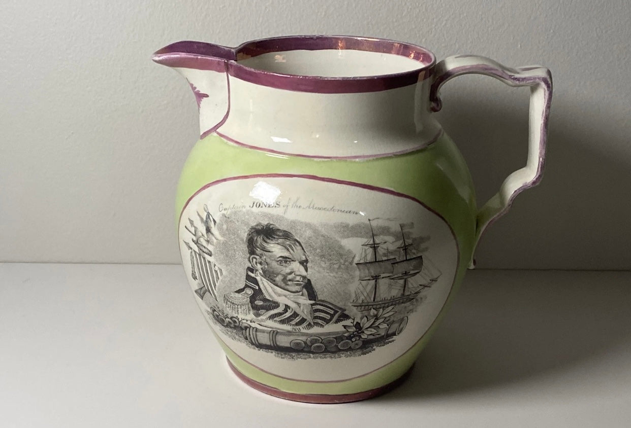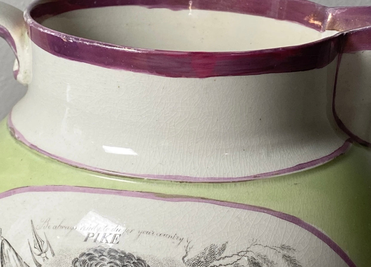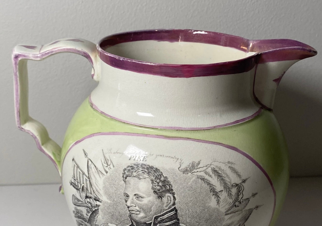 Staffordshire War of 1812 pitcher with Captain and Jones and Captain Pike. Very scarce apple green background color with pink luster. Displays excellent with highly professional chip repairs on the top rim. It measures 7 1/2” from the tip of the spout to the handle by 6 1/2” tall and dates circa 1815.