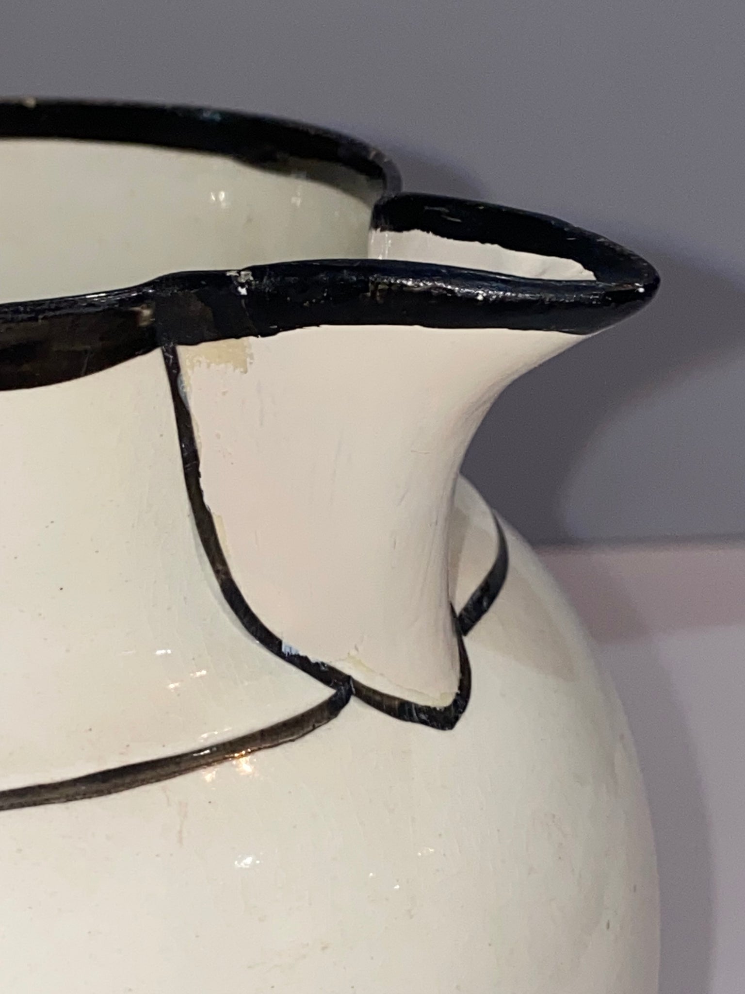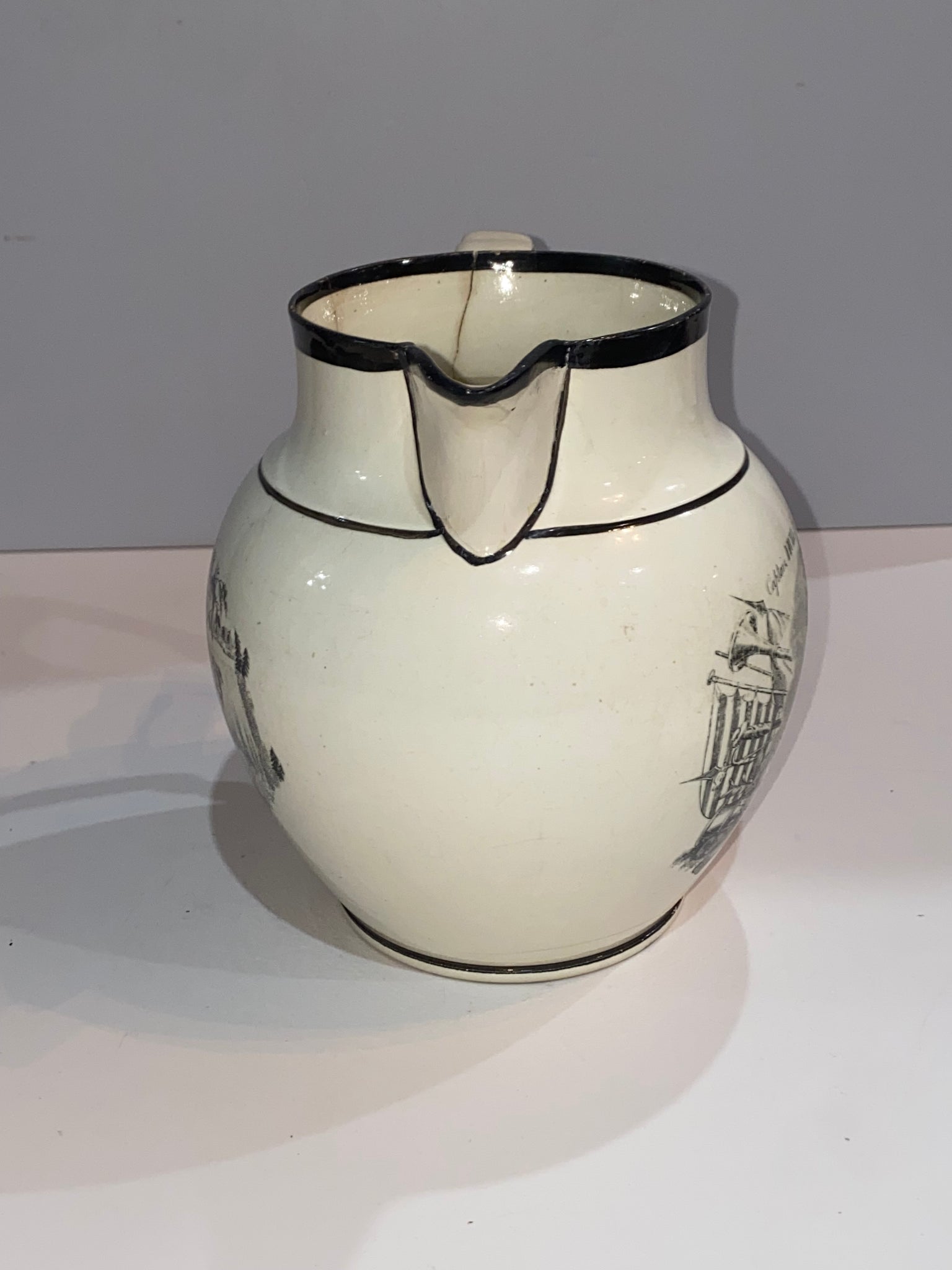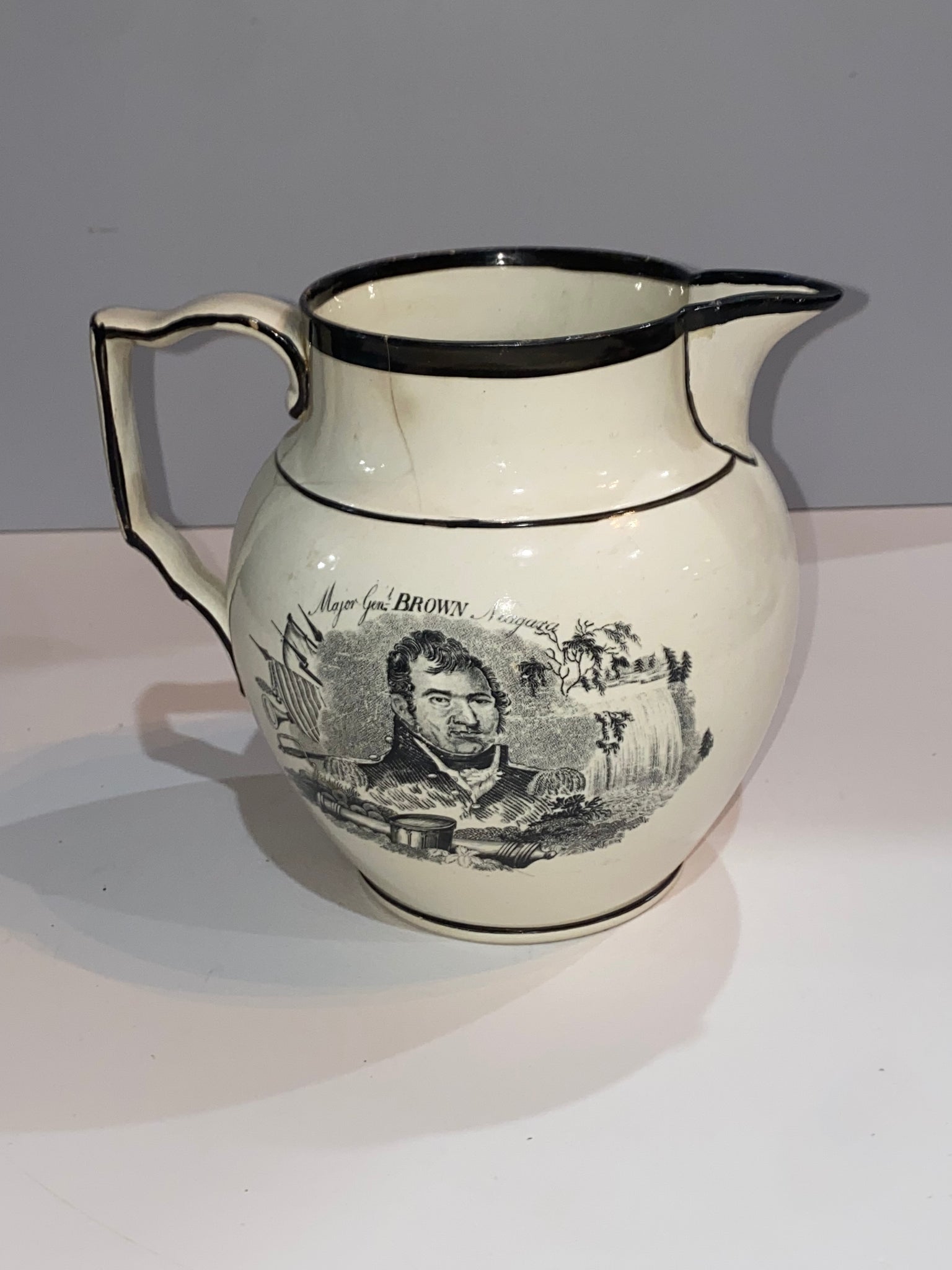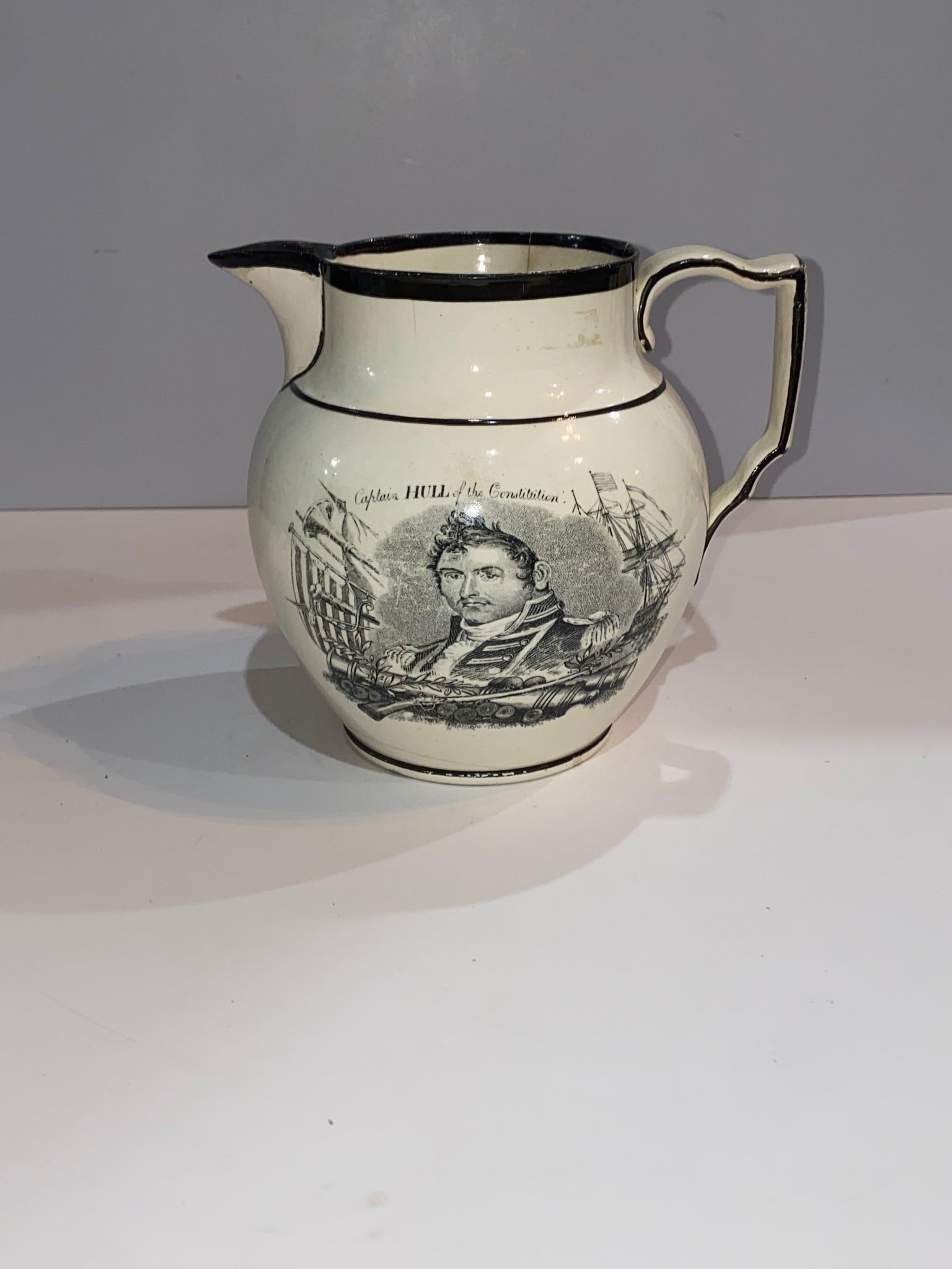 Staffordshire War of 1812 Pitcher with Captain Hull and Major Genl Brown. This piece displays fair with some hairlines and older repair to the spout. It measures 5 3/4” tall by 6 1/2” from the tip of the spout to the handle and dates circa 1815.