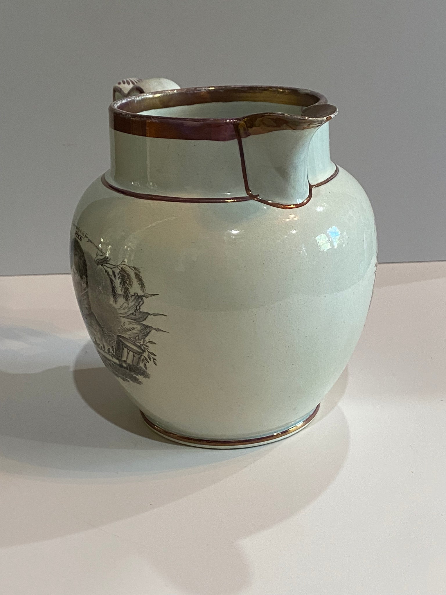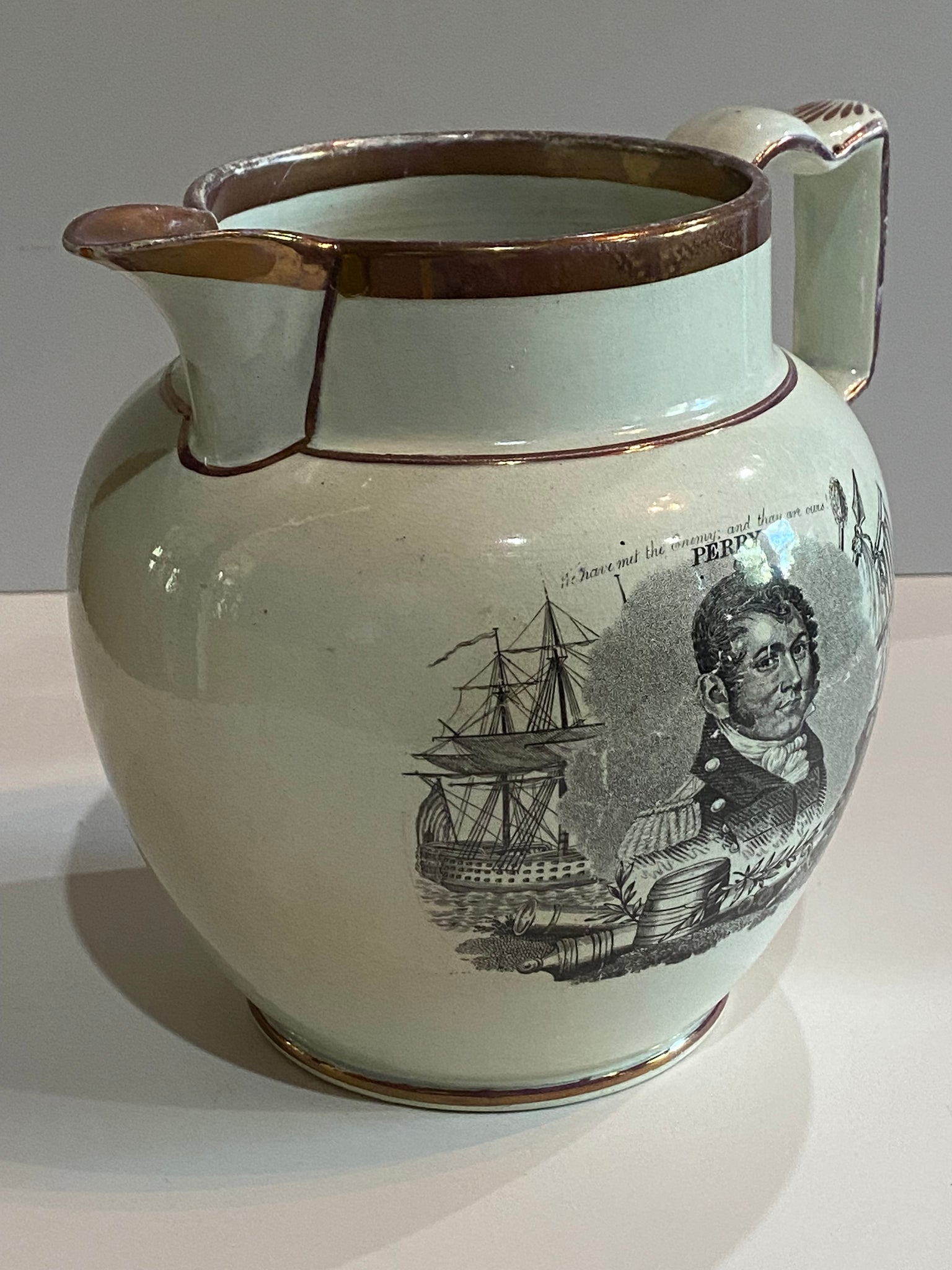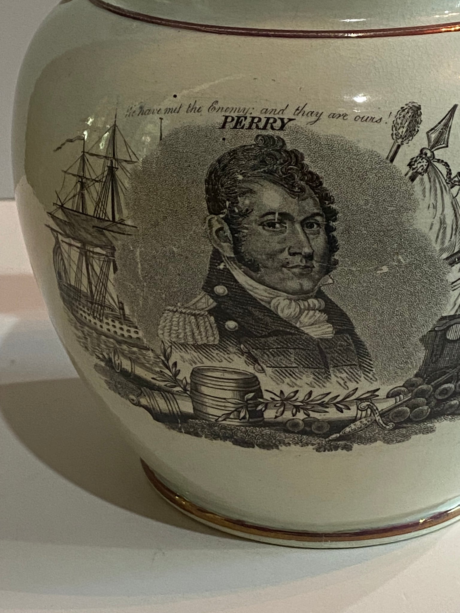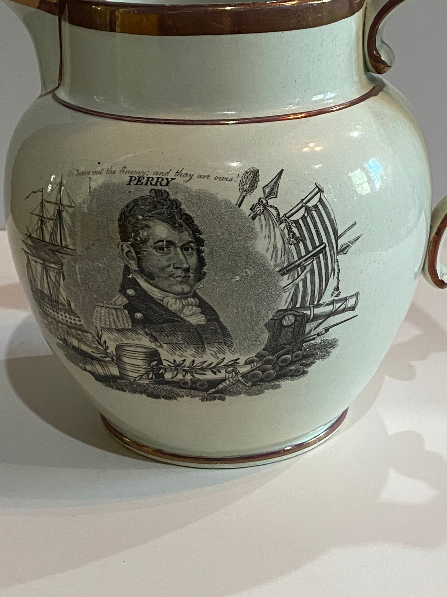 Staffordshire War of 1812 pitcher with transfers of Pike and Perry. Displays as perfect with professional repairs to hairlines. It measures 7 1/4” tall by 8 1/8”’ from the spout tip to the handle and it dates circa 1815.
