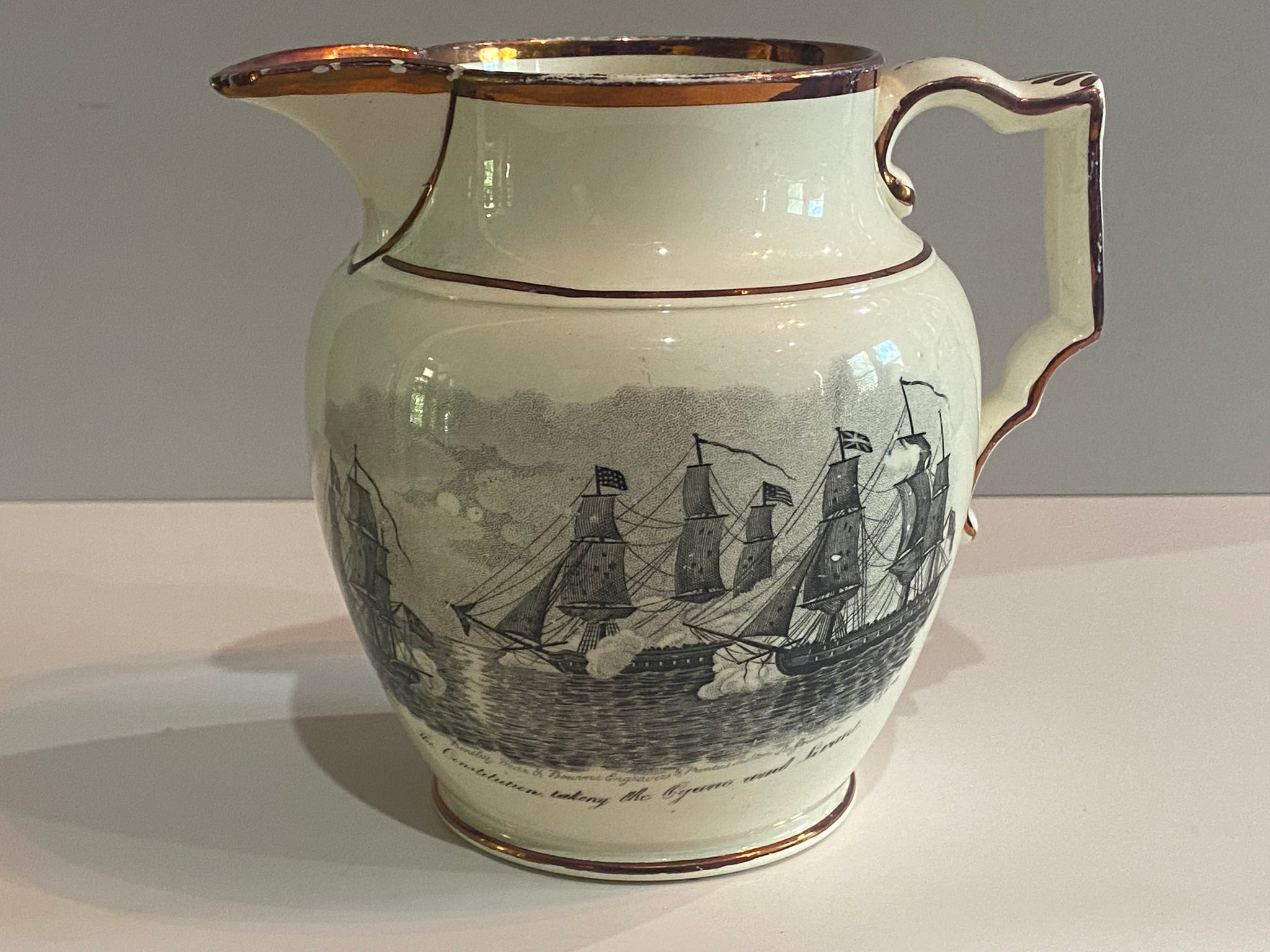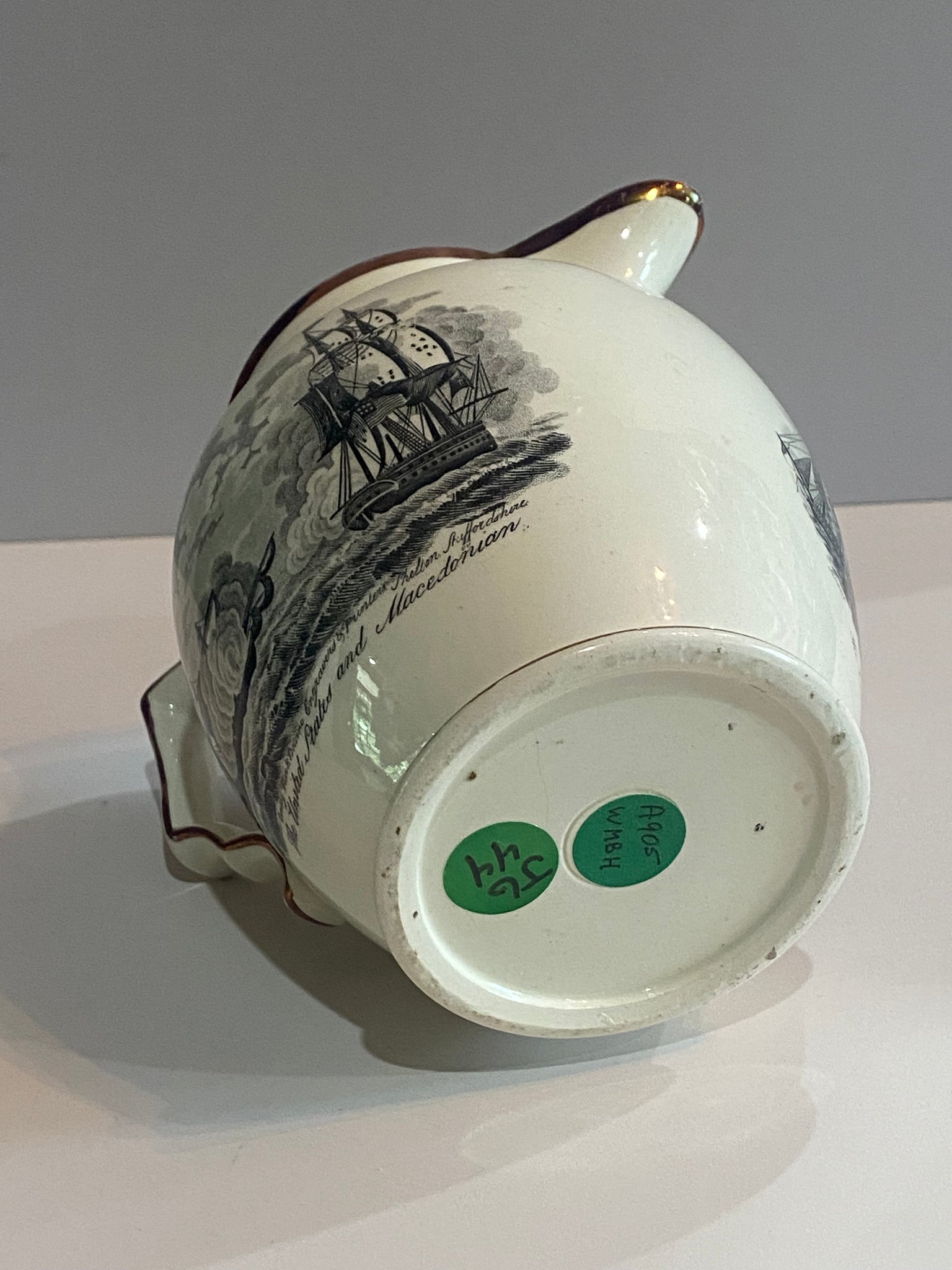 Staffordshire War of 1812 pitcher with scenes of “The United States and The Macedonian” and “The Constitution taking the Cyanne and Levant”. Displays as perfect with a very good professional repair to a short hairline. It measures 5 5/8” tall by 6 1/4” from the tip of the spout to the handle. It dates circa 1815.