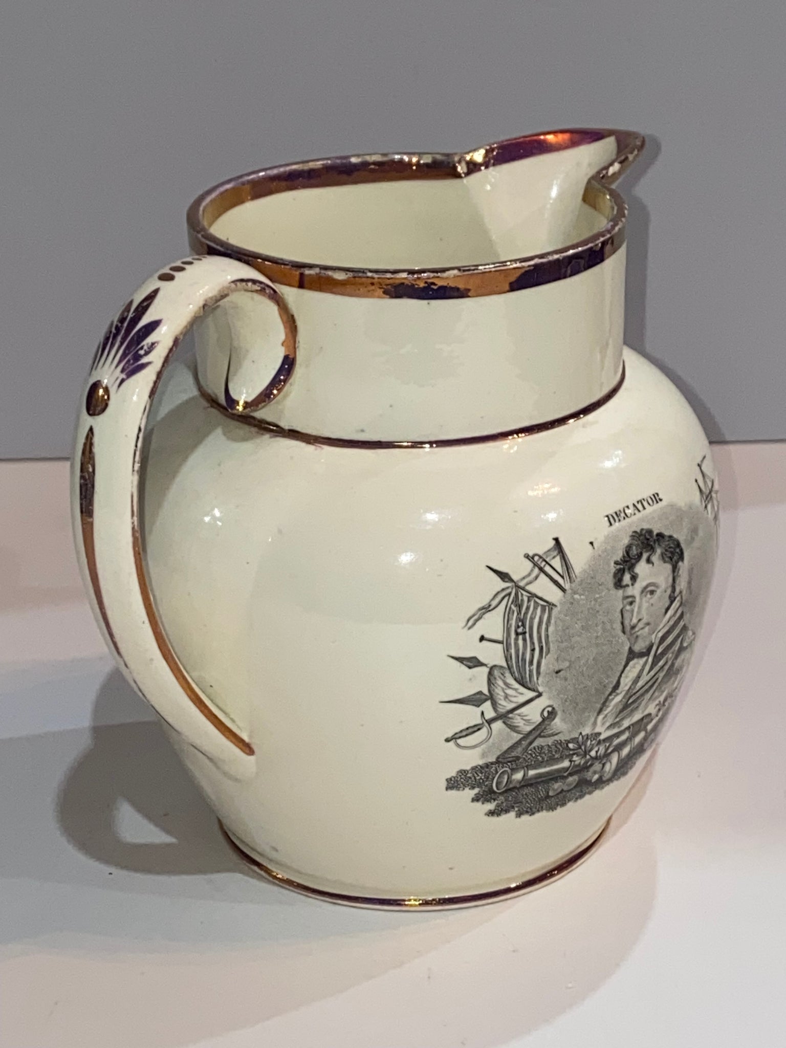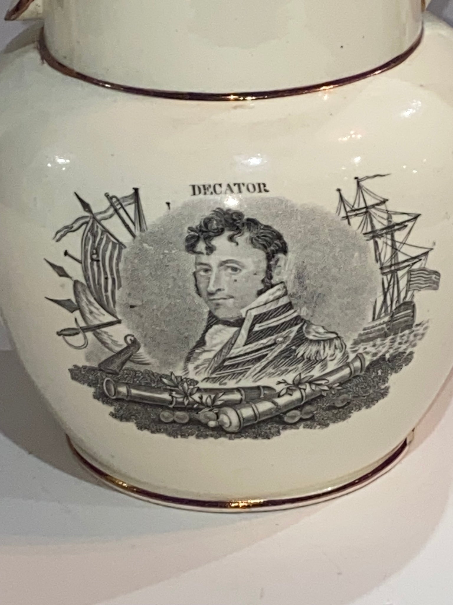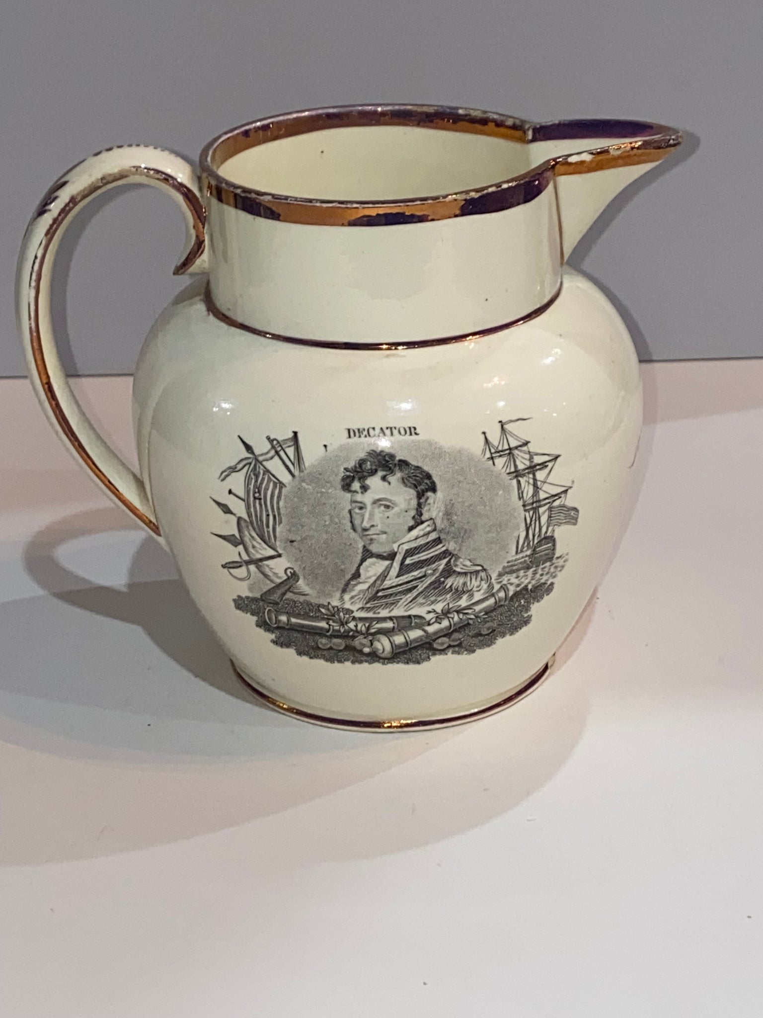 Staffordshire War of 1812 Pitcher With Decatur and Major Genl. Brown. In very nice condition with some very minor small chips and no repairs. It measures 5 1/2” tall by 6 1/4” from the tip of the spout to the handle and dates circa 1815.