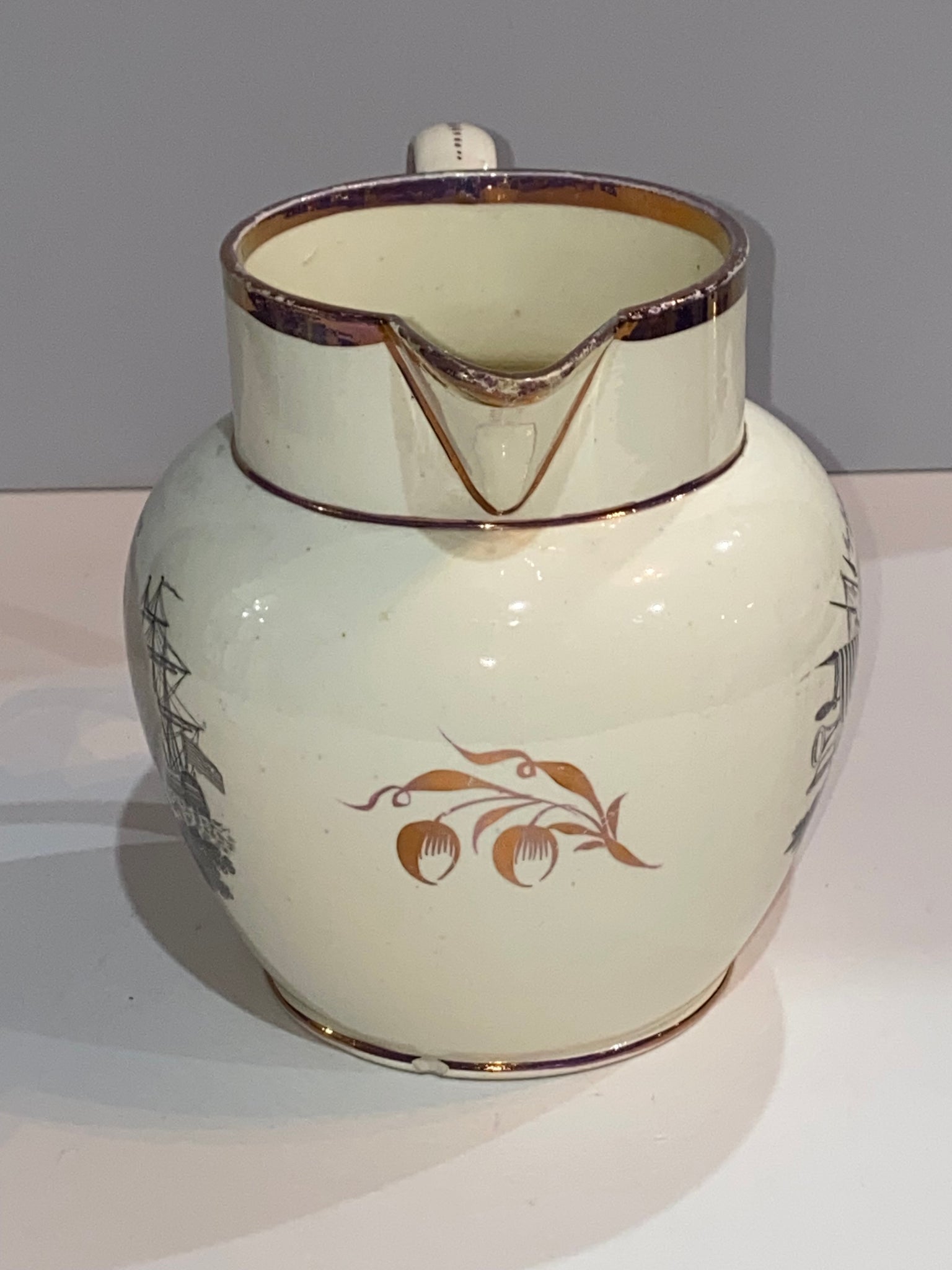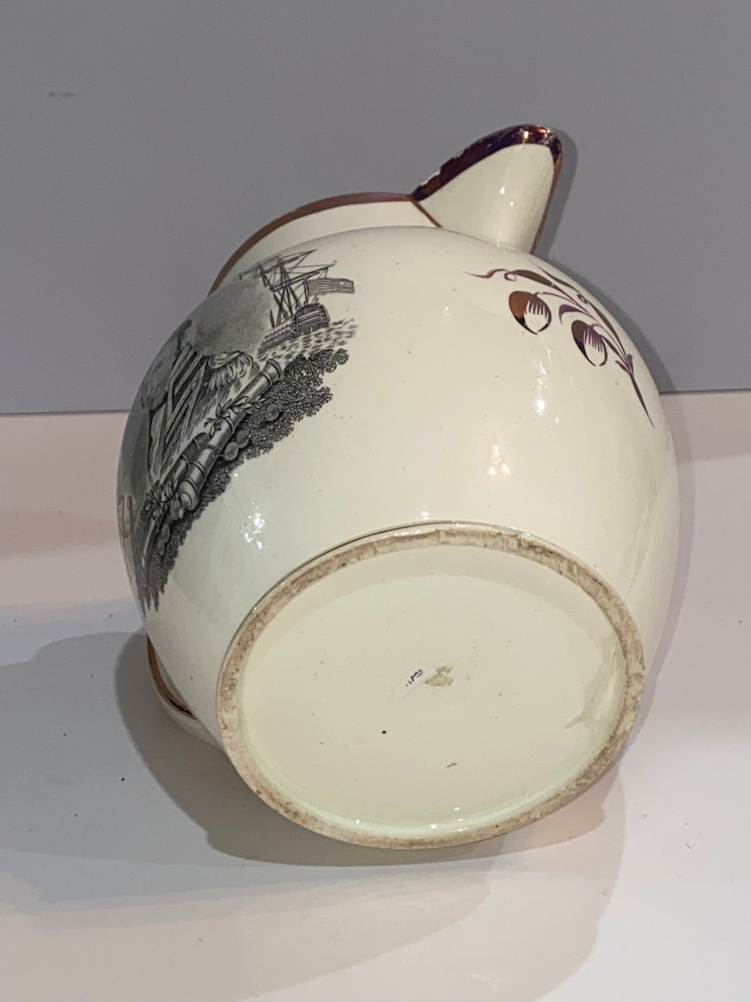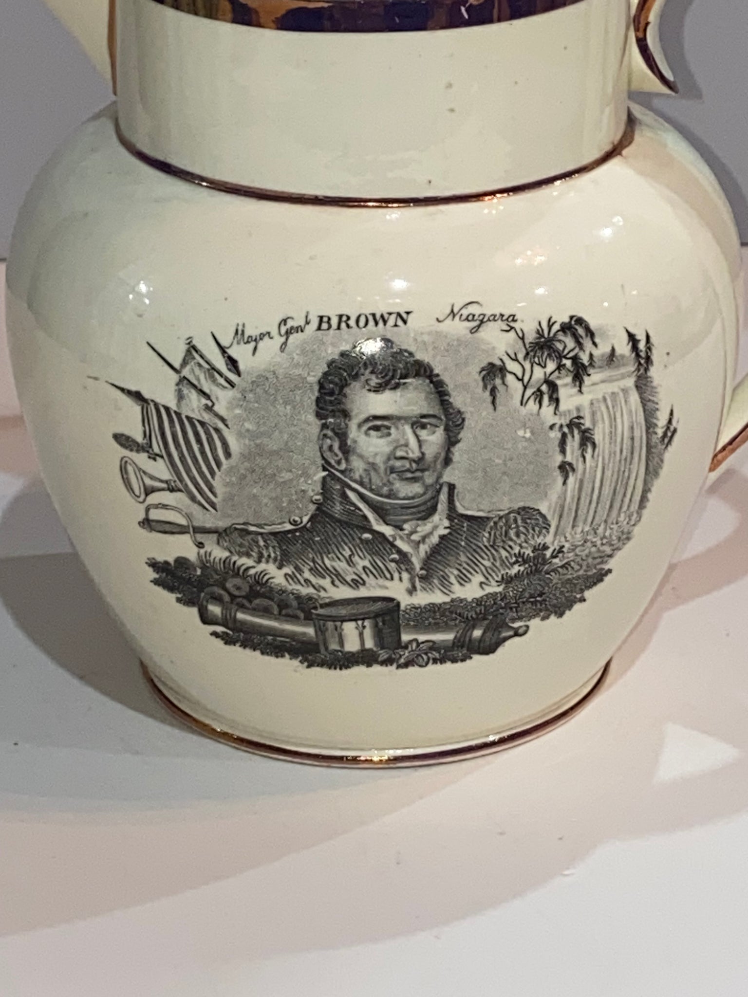 Staffordshire War of 1812 Pitcher With Decatur and Major Genl. Brown. In very nice condition with some very minor small chips and no repairs. It measures 5 1/2” tall by 6 1/4” from the tip of the spout to the handle and dates circa 1815.