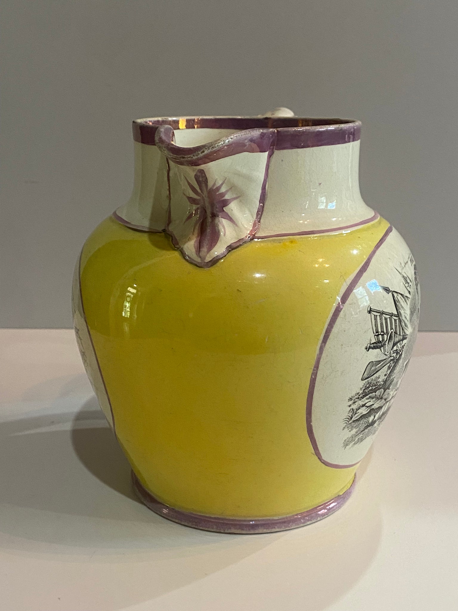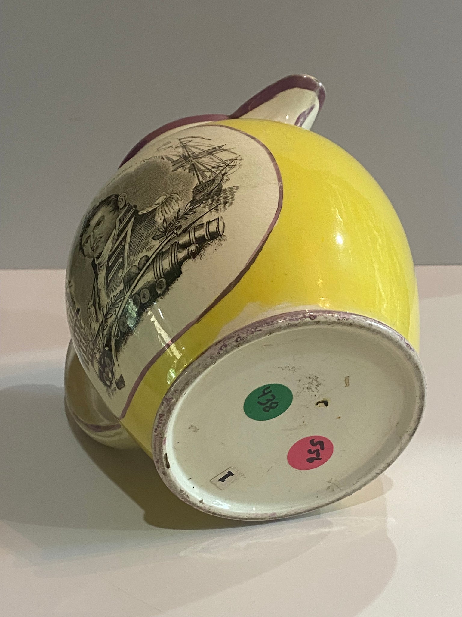 Staffordshire War of 1812 pitcher with Captain Hull and Pike. Very nice condition with no repairs but does show some wear in a few spots. It measures 6 5/8” tall by 7 3/4” from the tip of the spout to the handle and dates circa 1815. Very scarce to find with a yellow background.