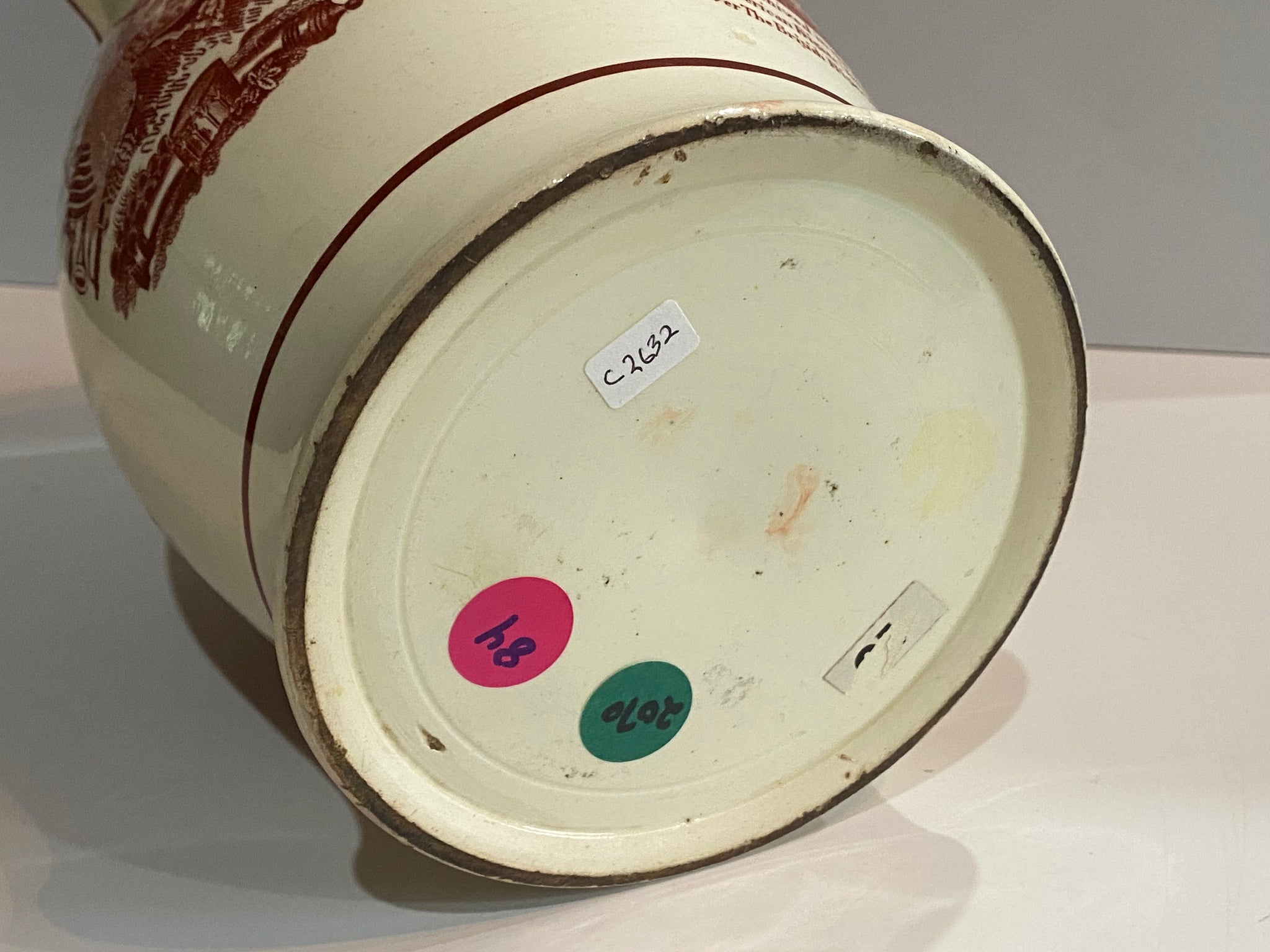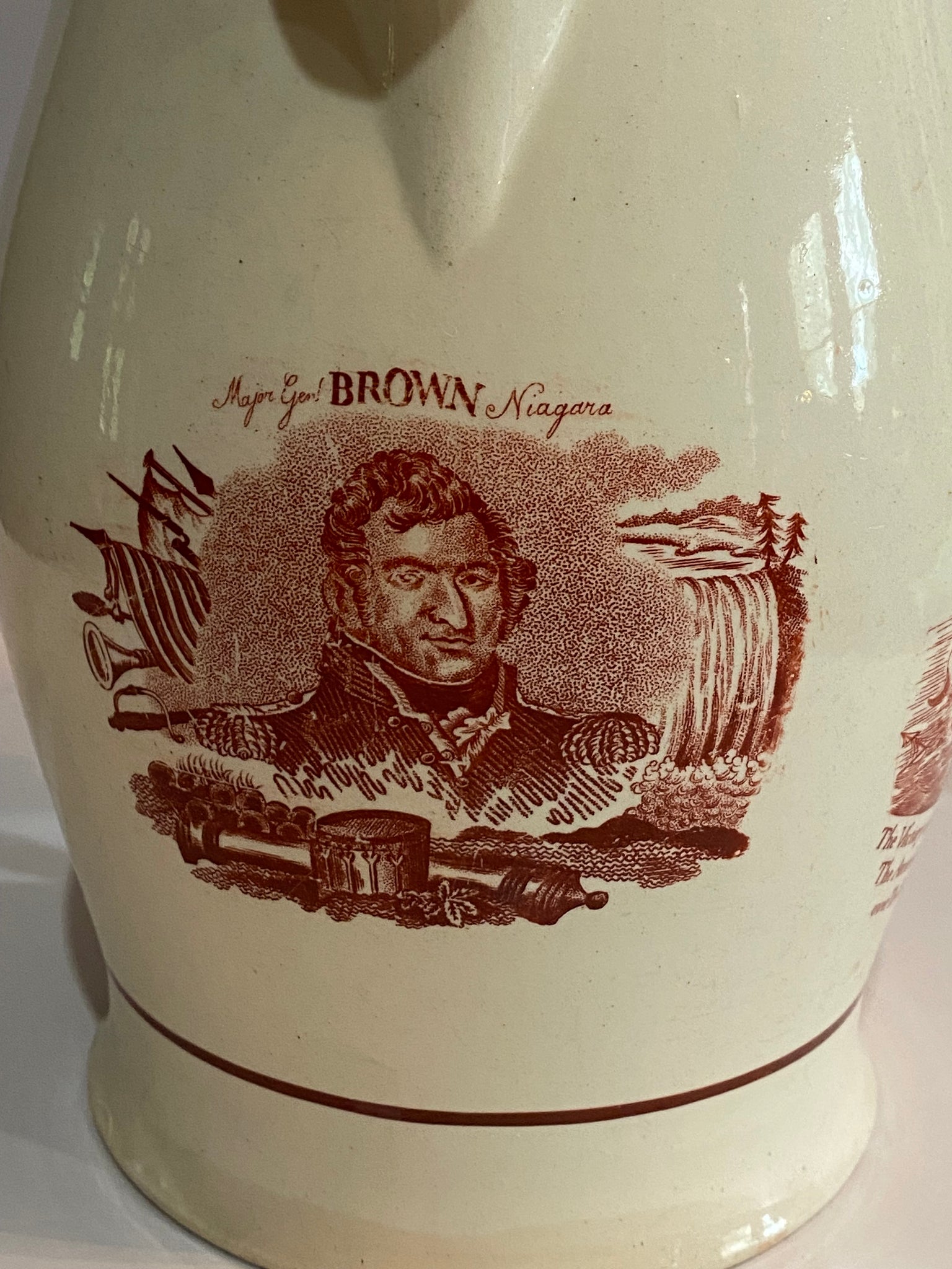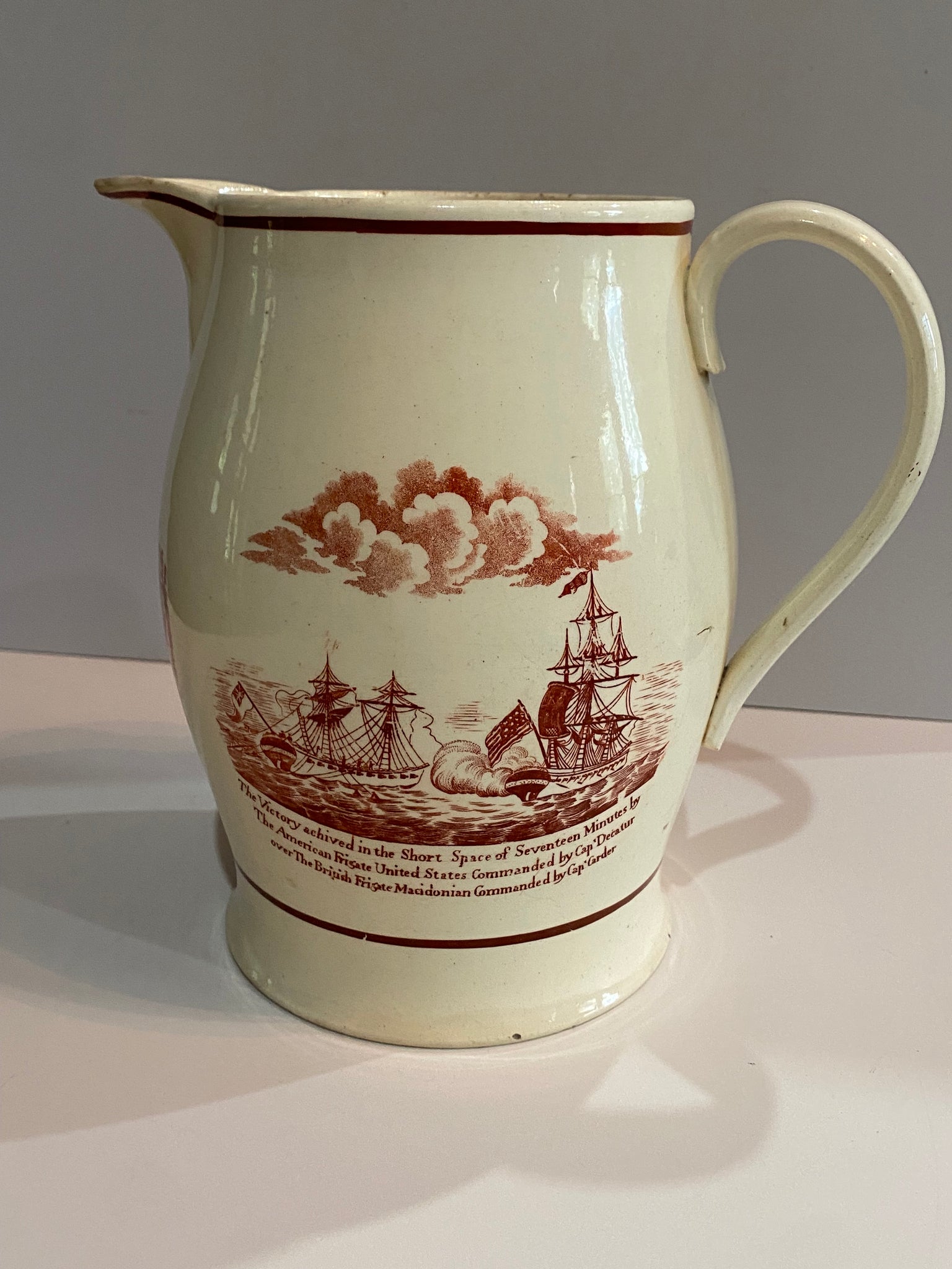 Staffordshire Creamware Liverpool pitcher with Major General Brown transfer under the spout. On one side shows American Frigate United States Victory over the British Ship Macedonian, on the other side shows an Industry transfer. It measures 8 1/8” tall by 8 1/4” from the tip of the spout to the handle and dates circa 1815. Scarce form and transfer color for these particular transfers.