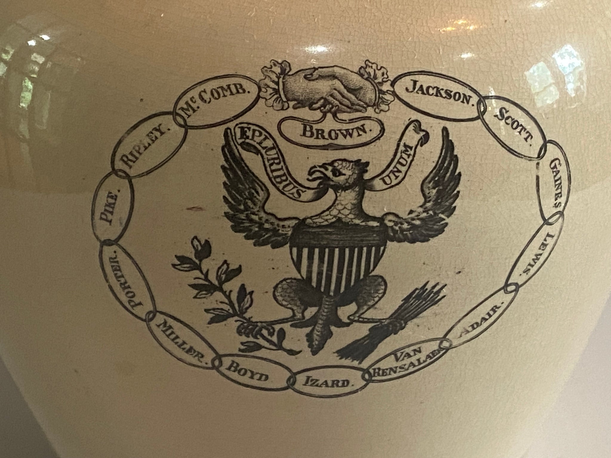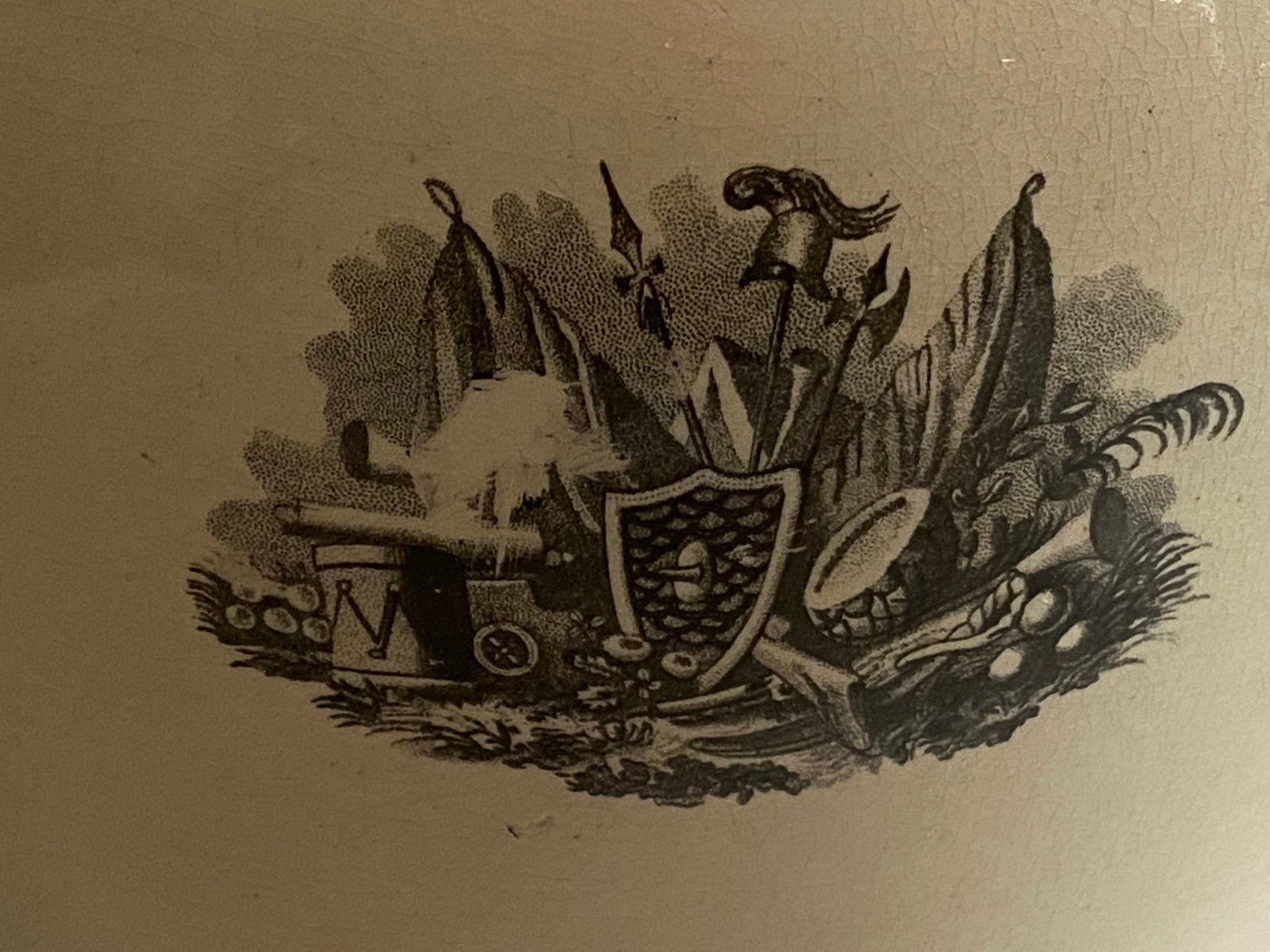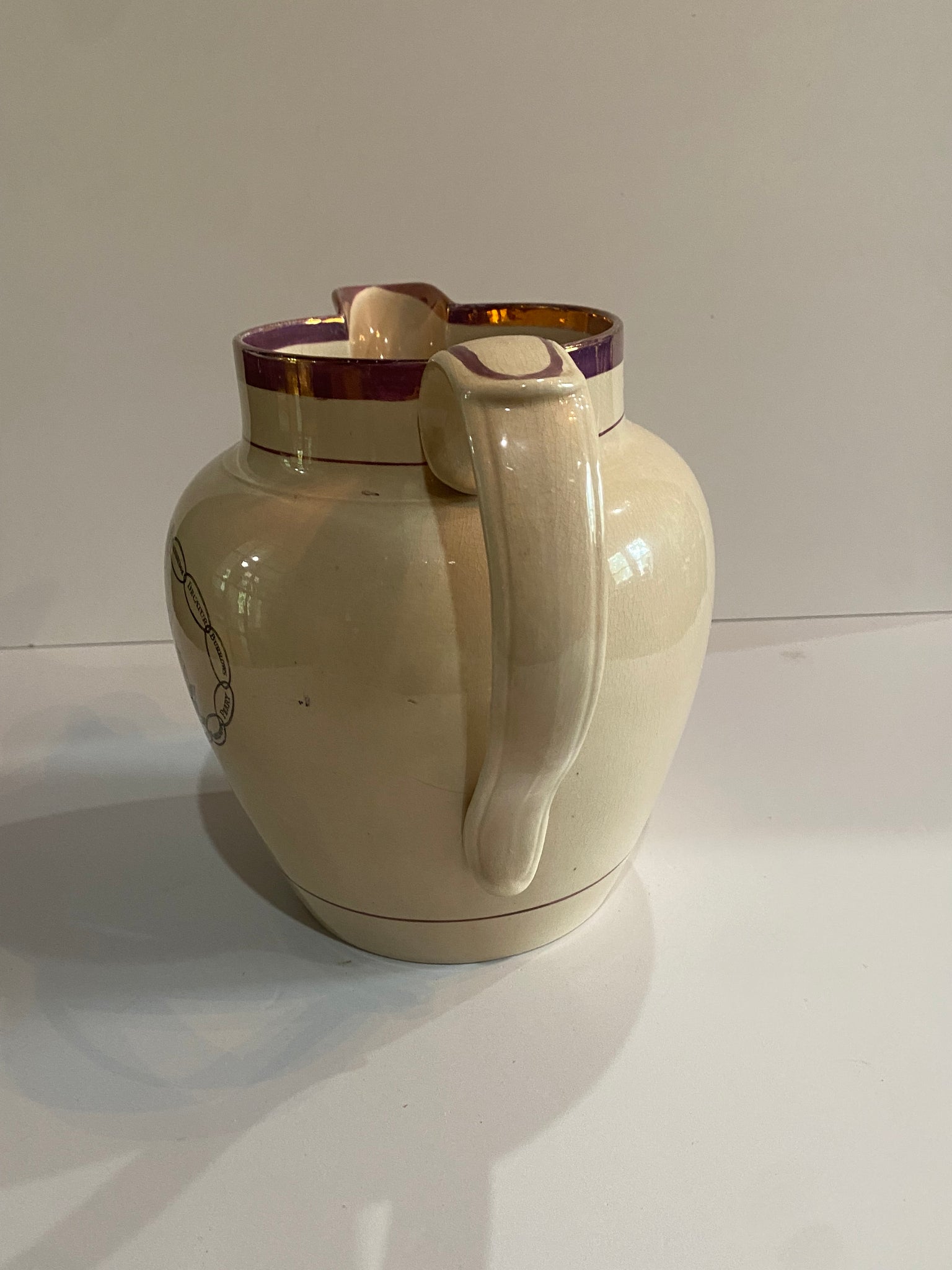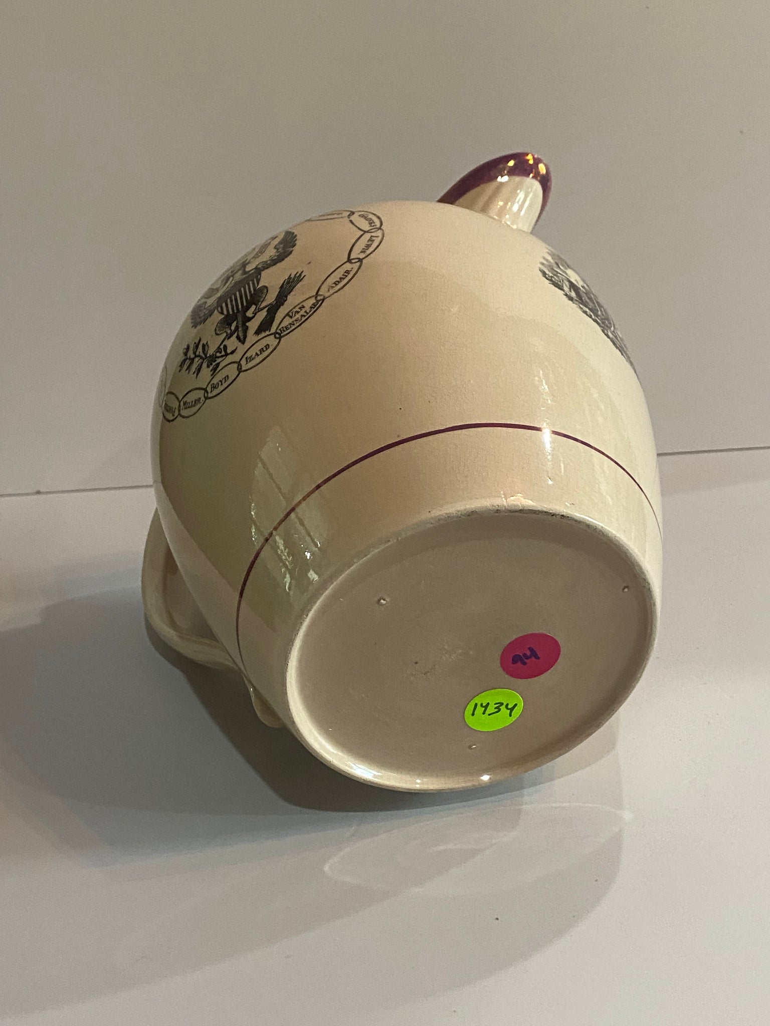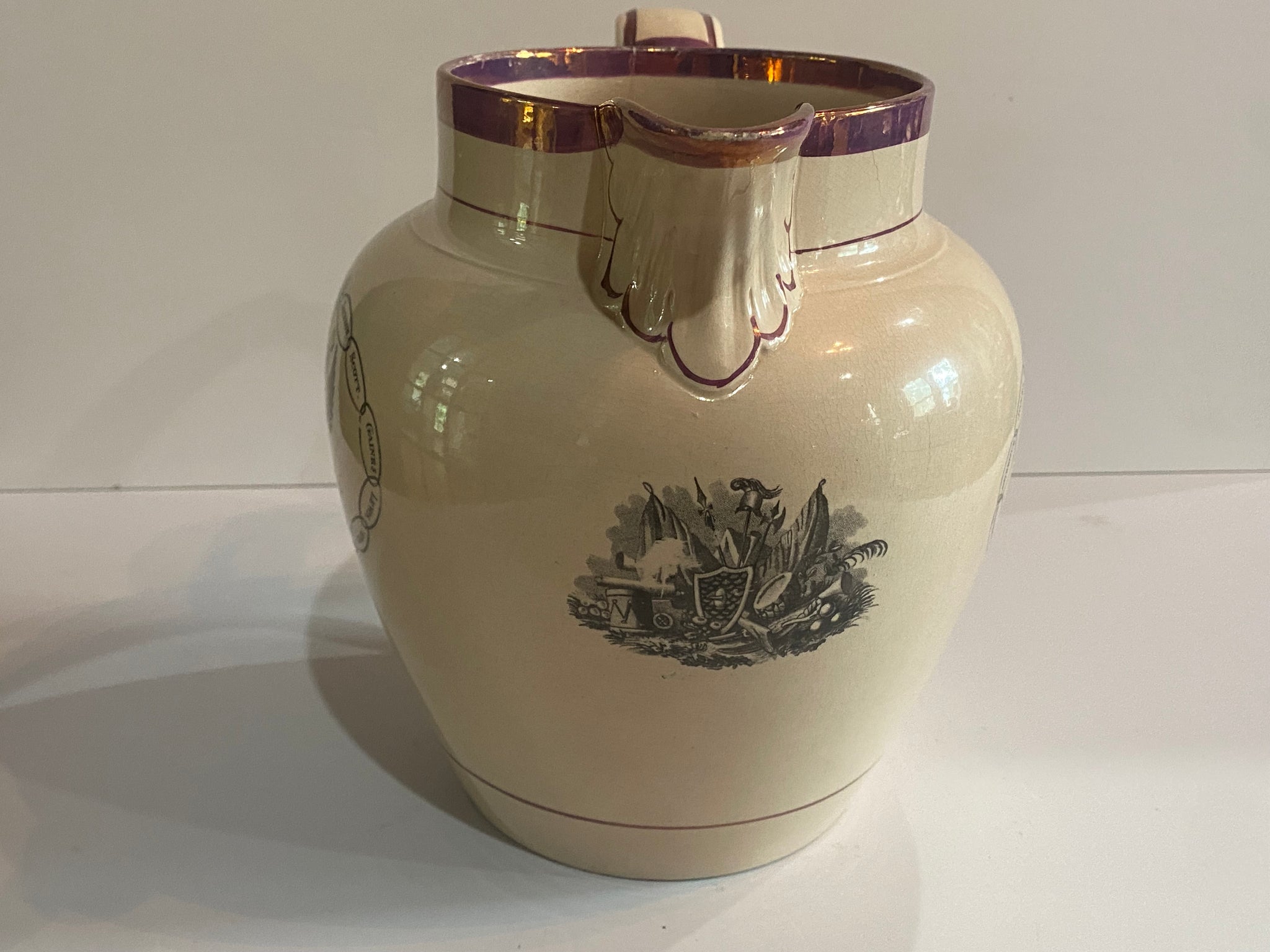Staffordshire War of 1812 Army and Navel Heros pitcher. Very nice condition with 2 very shirt faint hairlines and small crows foot in the body. Impressive size measuring 7 7/8” tall and dates circa 1815. Made by Enoch Wood and Sons.