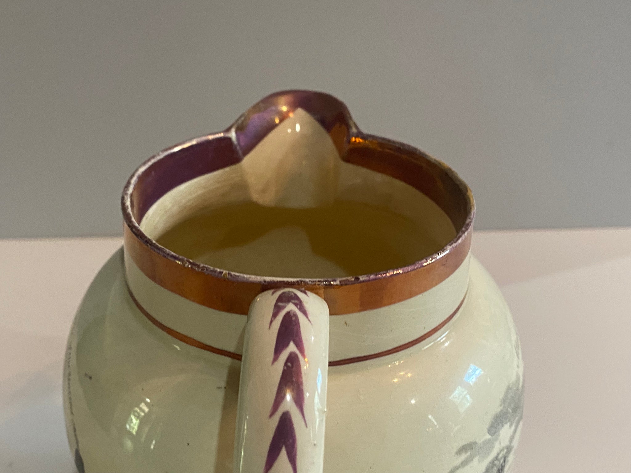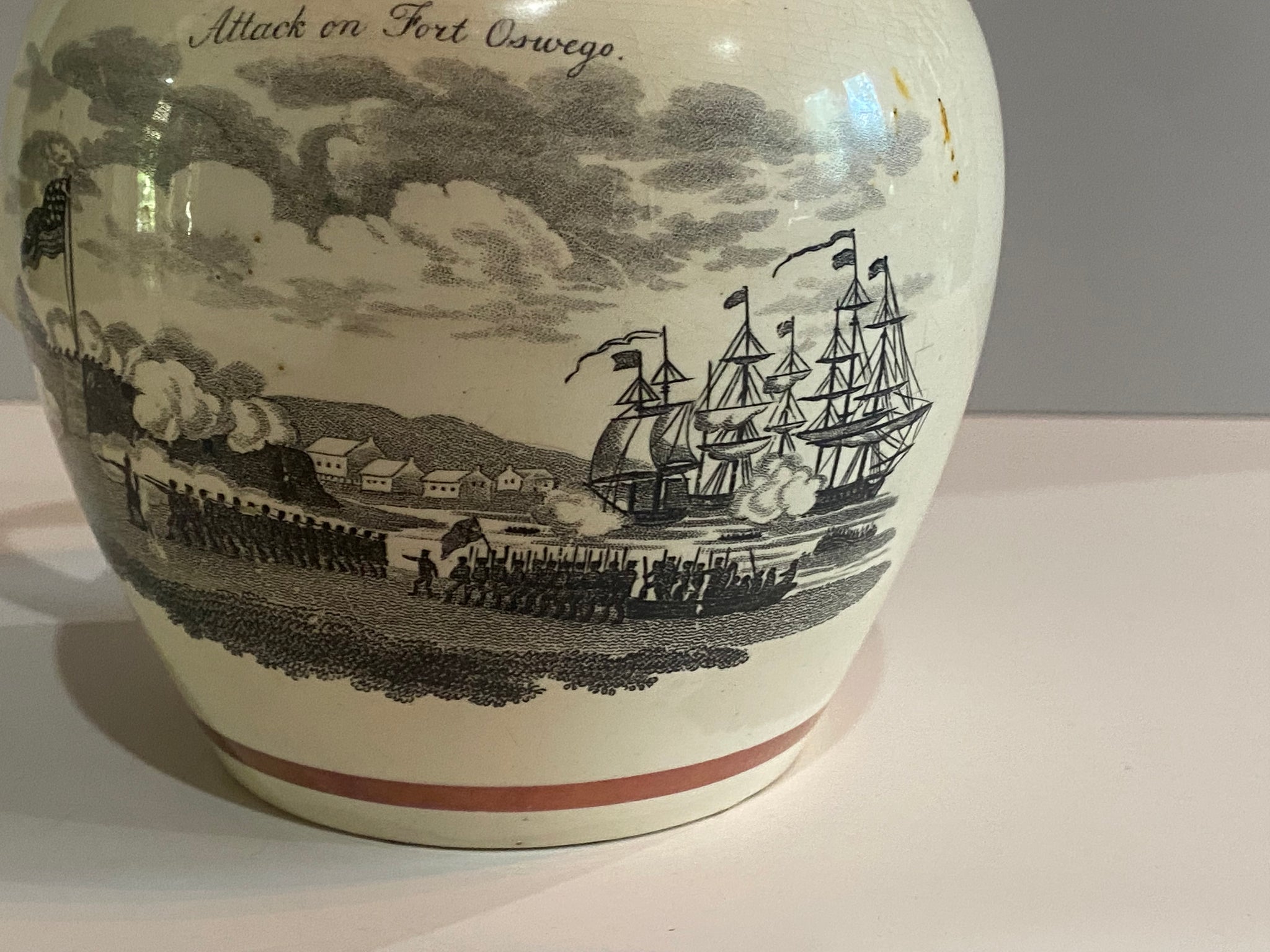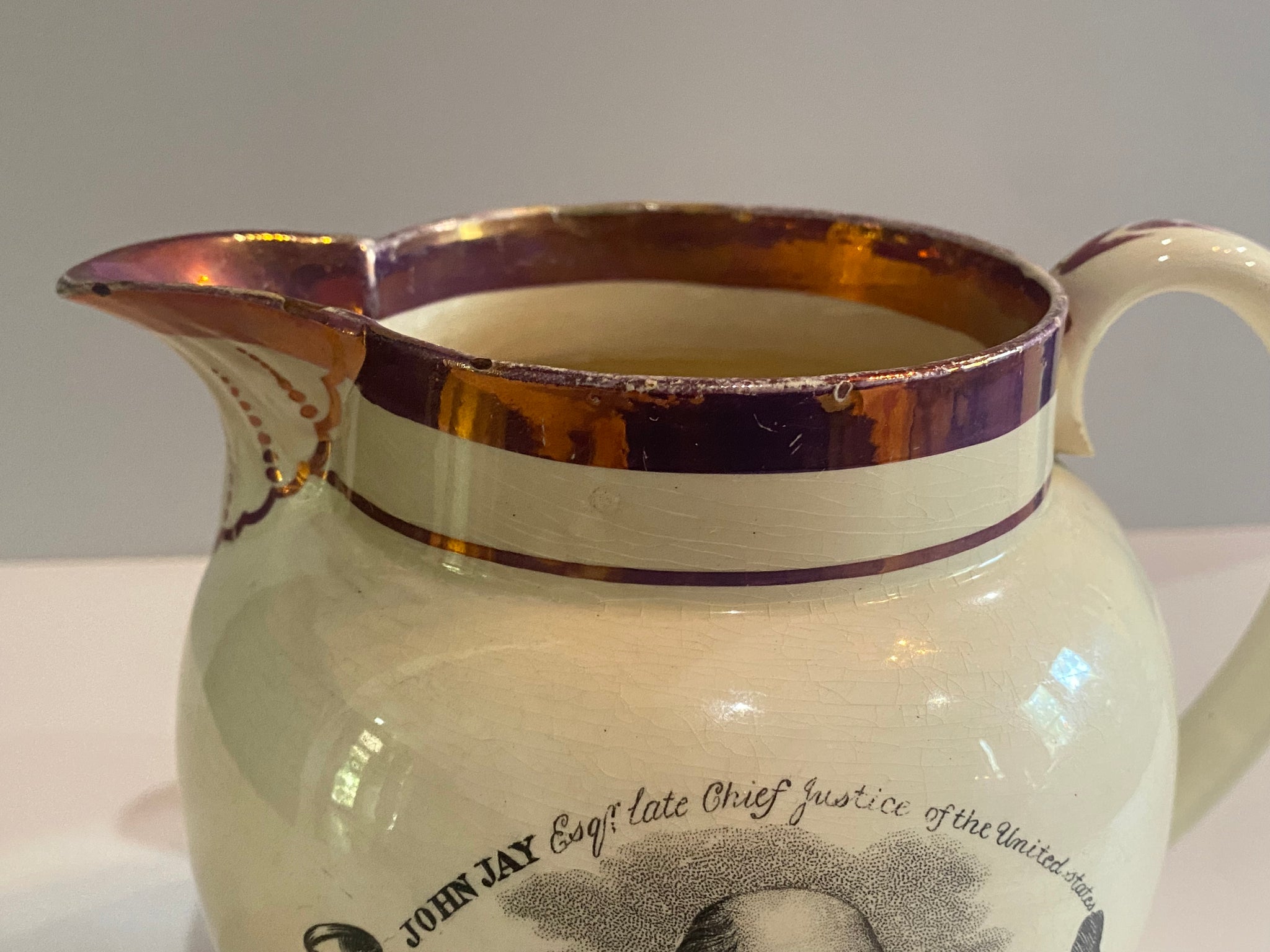 Staffordshire War of 1812 Pitcher with “John Jay Esq. Late Chief Justice of the United States” and “Attack on Fort Oswago”. Both are fairly scarce transfers to try and find on these pieces. In good condition with a small older chip repair on the inner rim. It measures 5 3/8” tall by 6 1/4” from the tip of the spout to the handle and dates circa 1815.