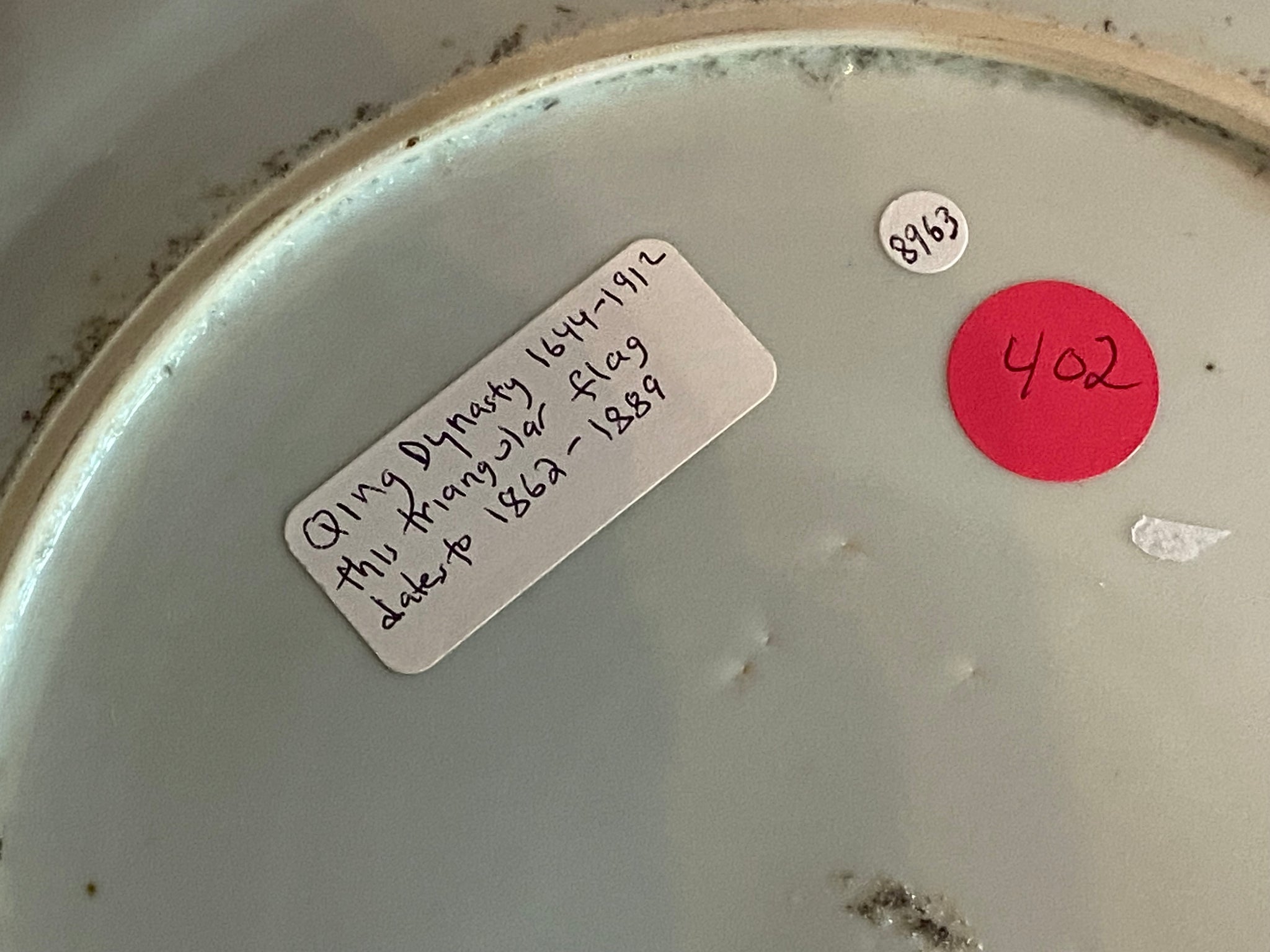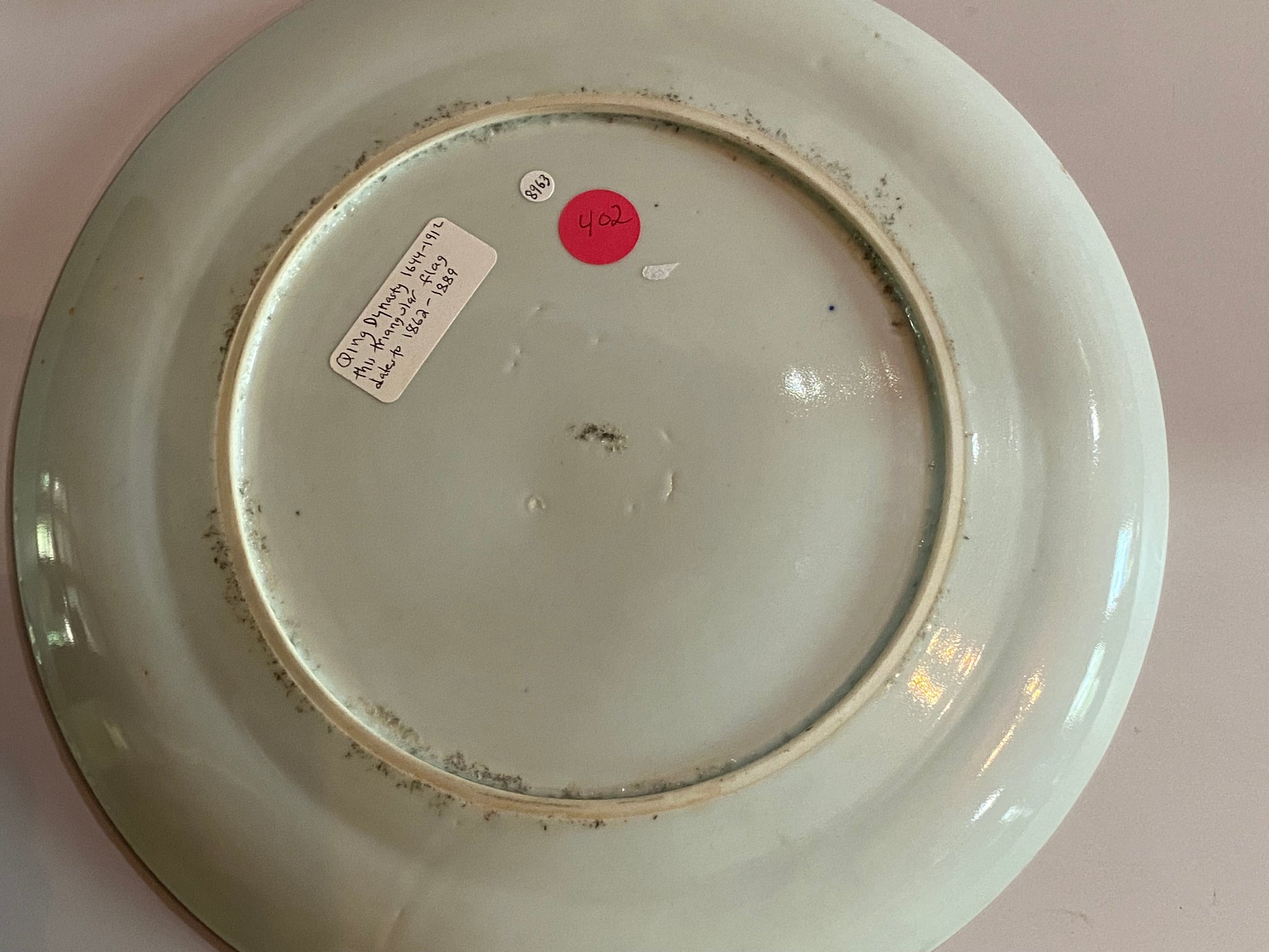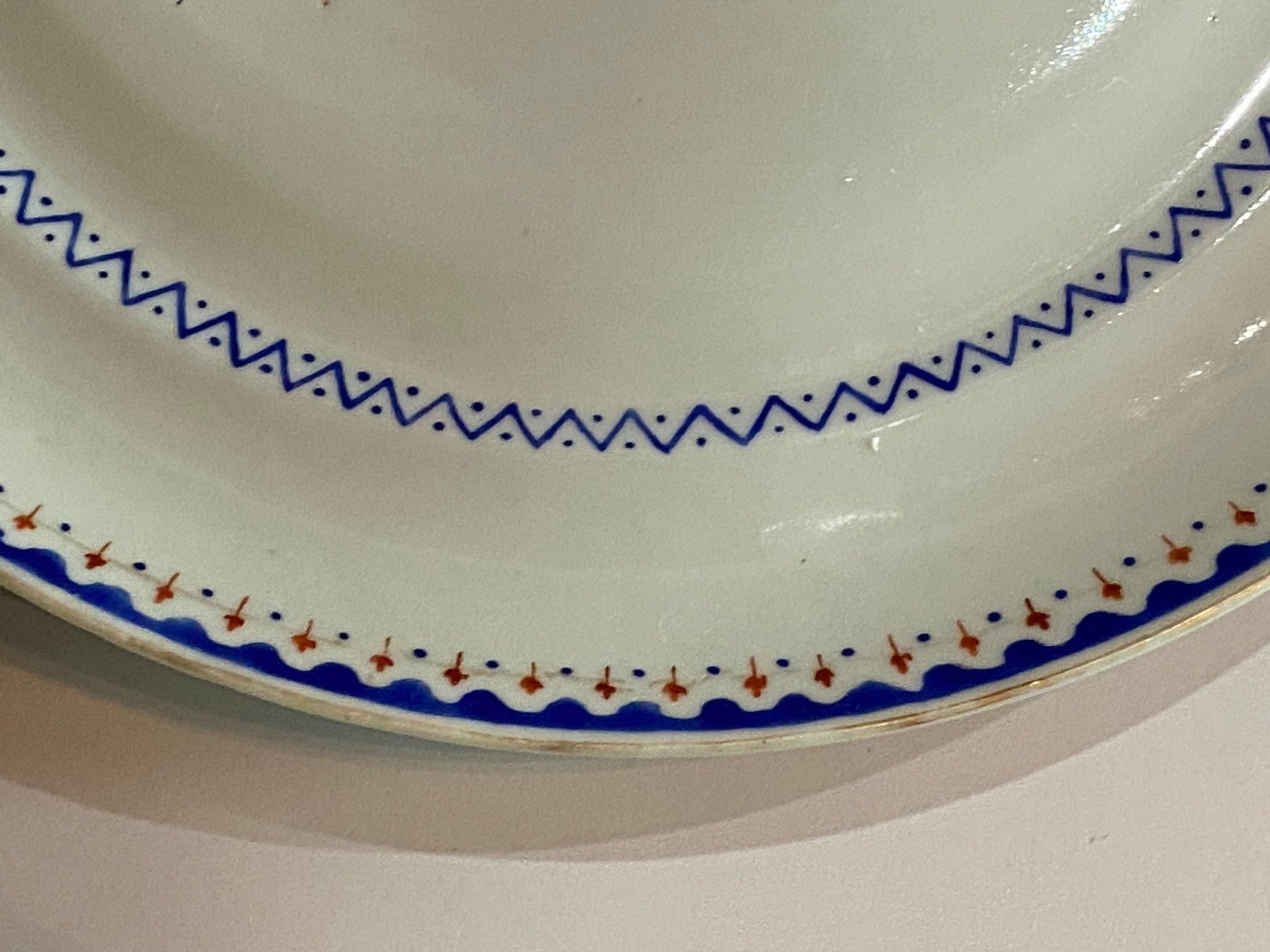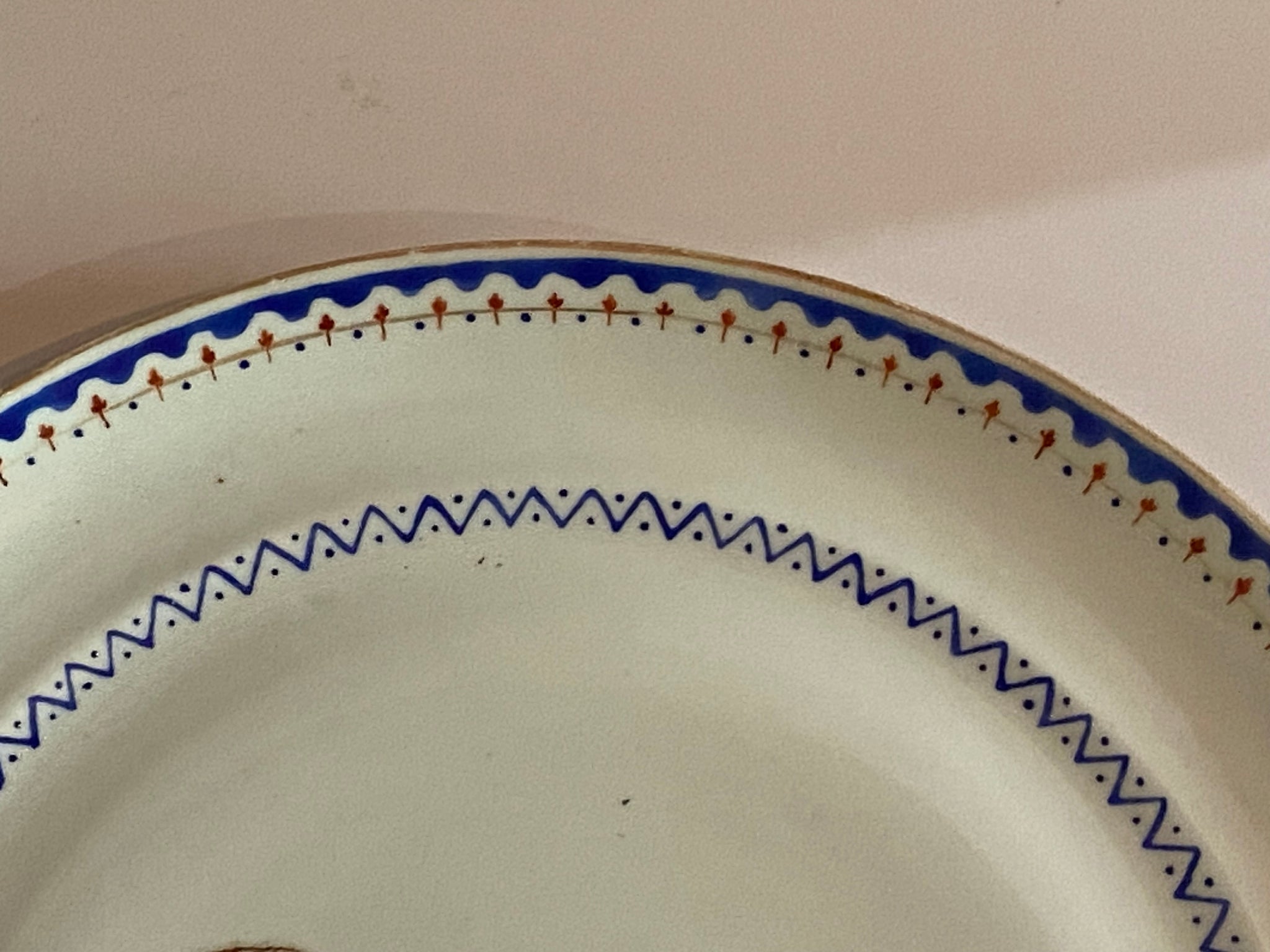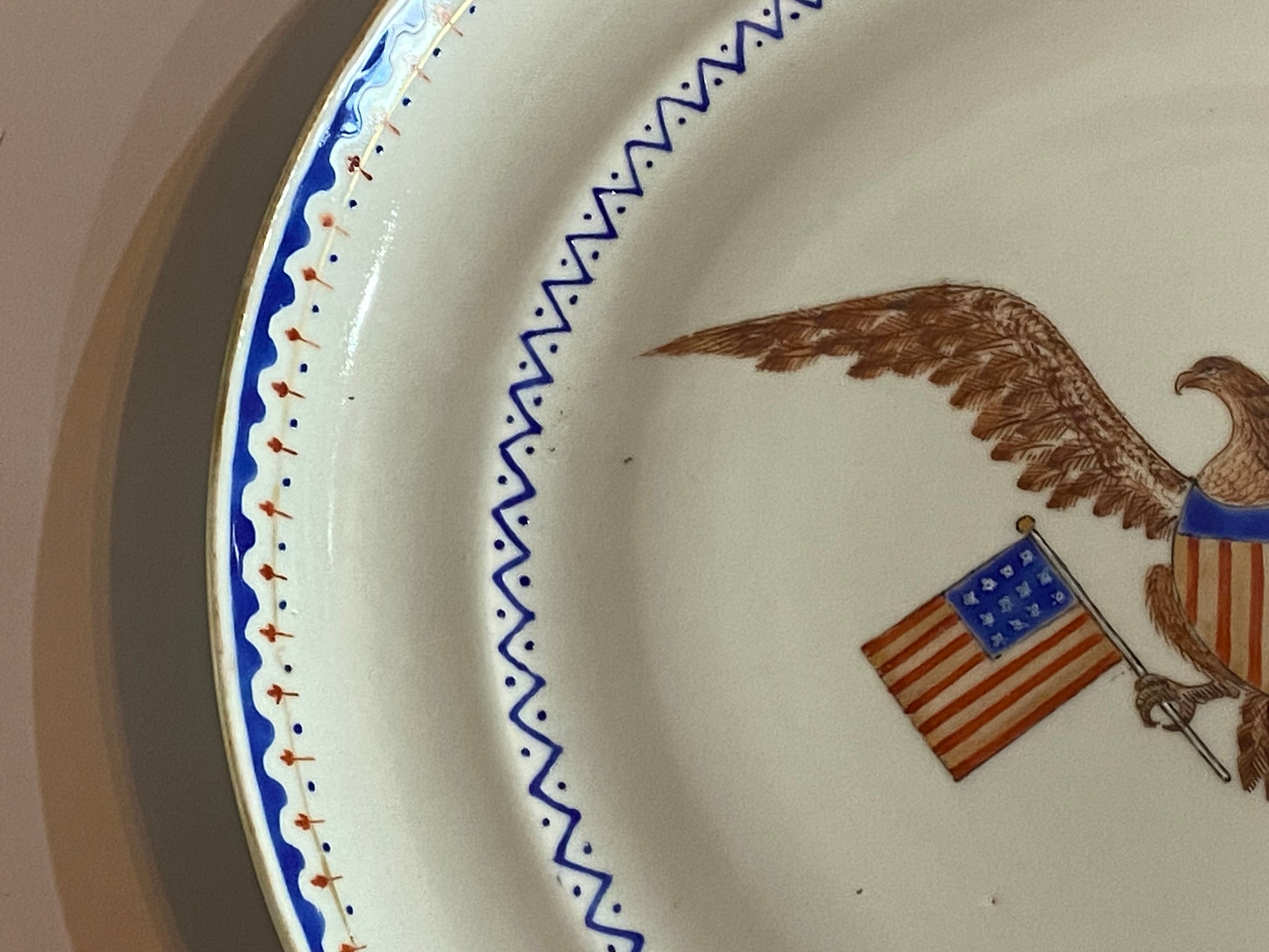 Antique 19th Century Chinese Export Porcelain Plate with Seal of United States and Triangular Qing Dynasty flag With American flag. Perfect condition with no chips, cracks or repairs. It measures 10 1/2” in diameter.