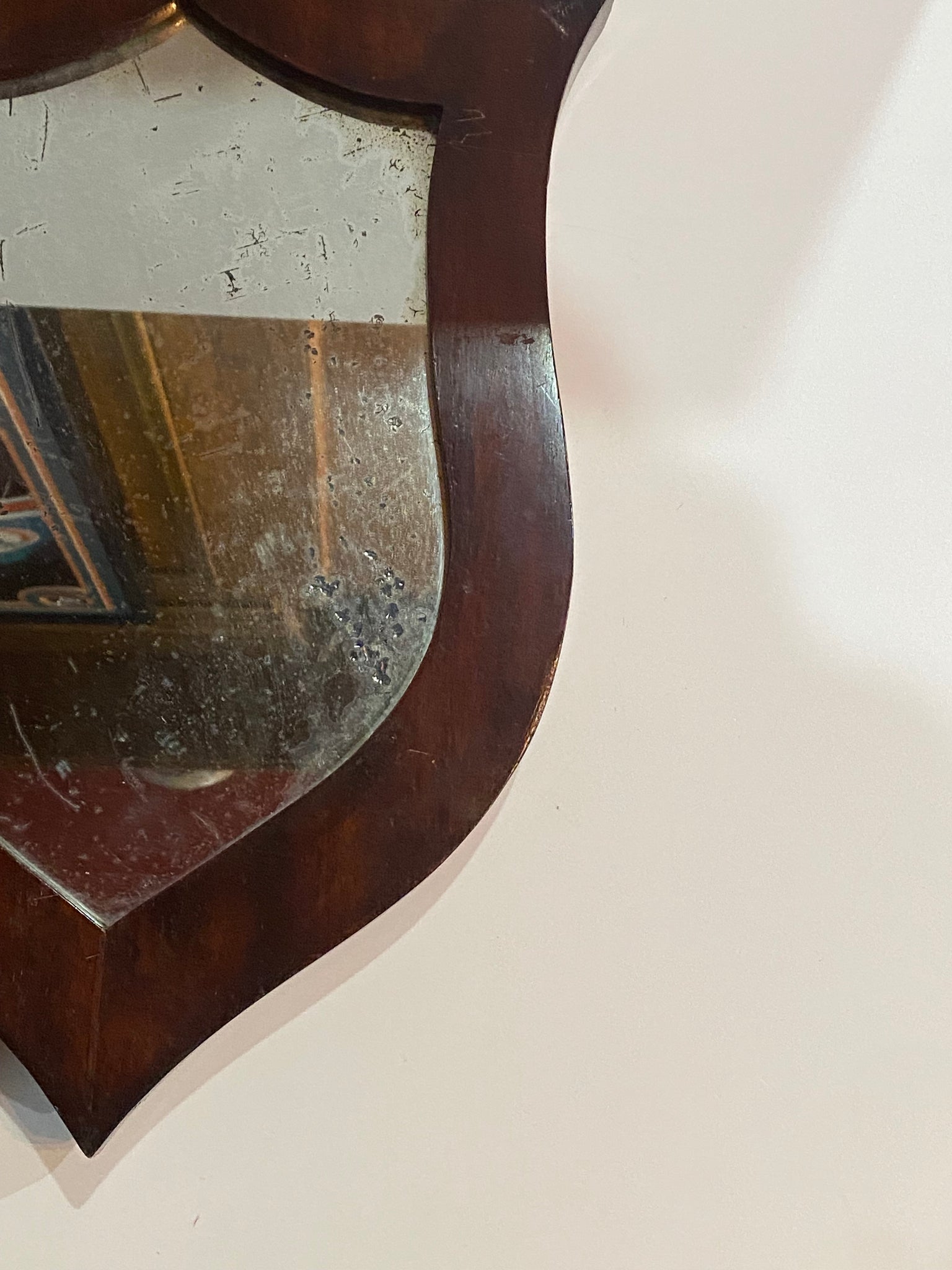 Antique 19th century wooden frame mirror in the shape of shield. Minor scuffs to the frame and scratches to original glass mirror. It measures 12” by 17 3/4”.