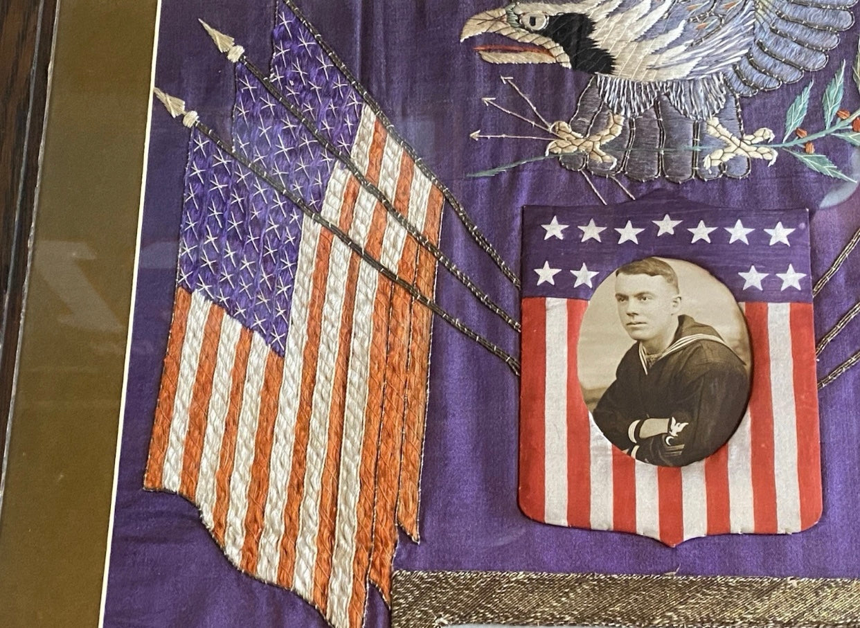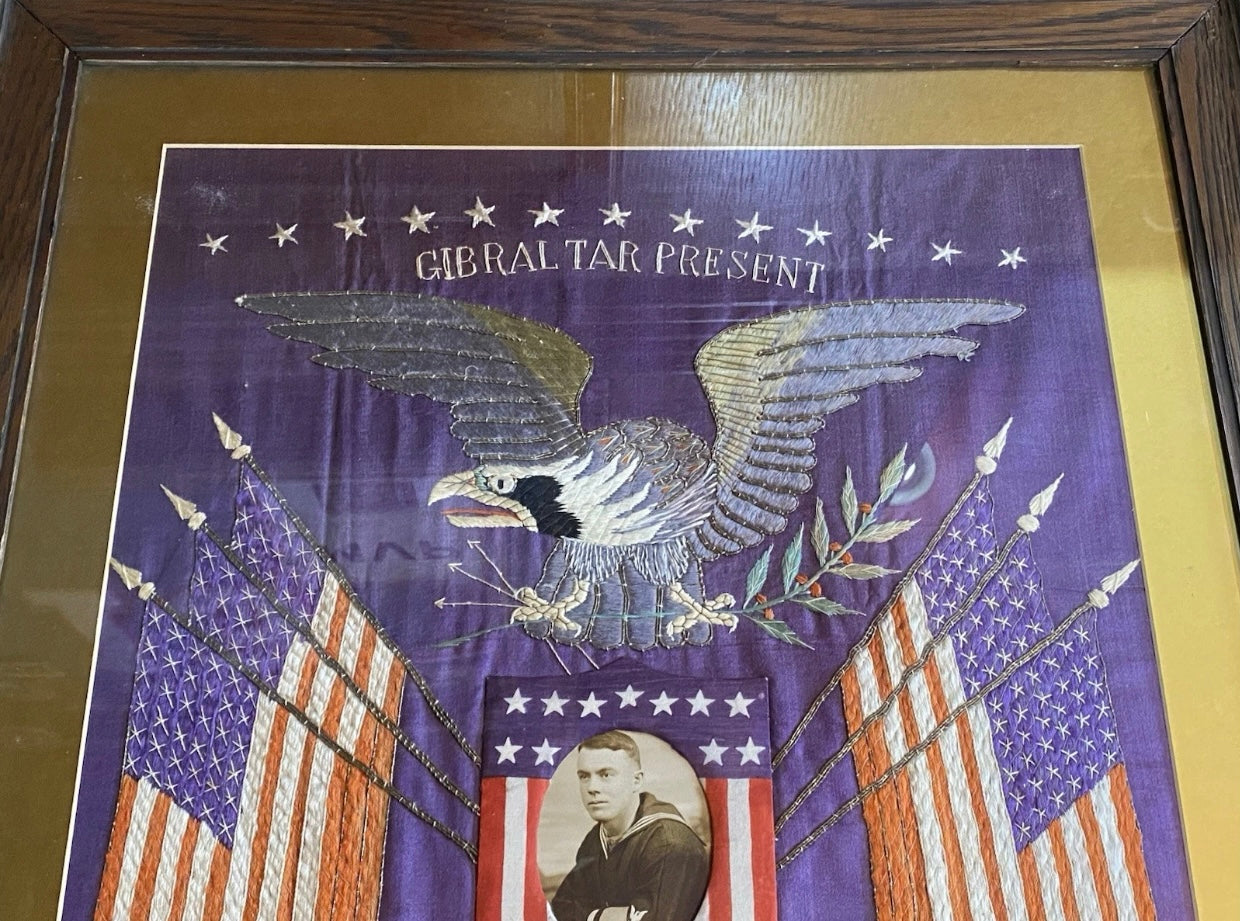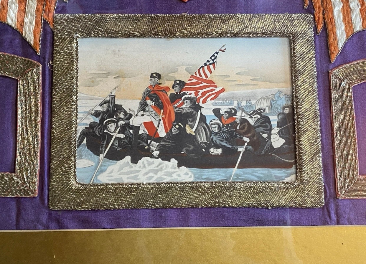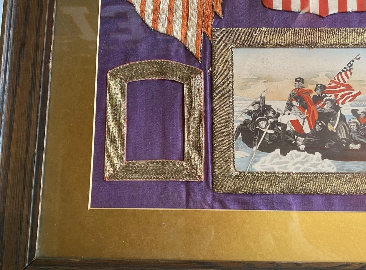 Antique Japanese Silk Embroidery for a Sailor. Very nice patriotic piece with eagle and American Flags. Also has photograph of sailor, silk Washington Crossing Delaware scene and two empty photo holders. Very nice condition with bright color. The entire piece measures 25 1/2” by 31 1/2”.