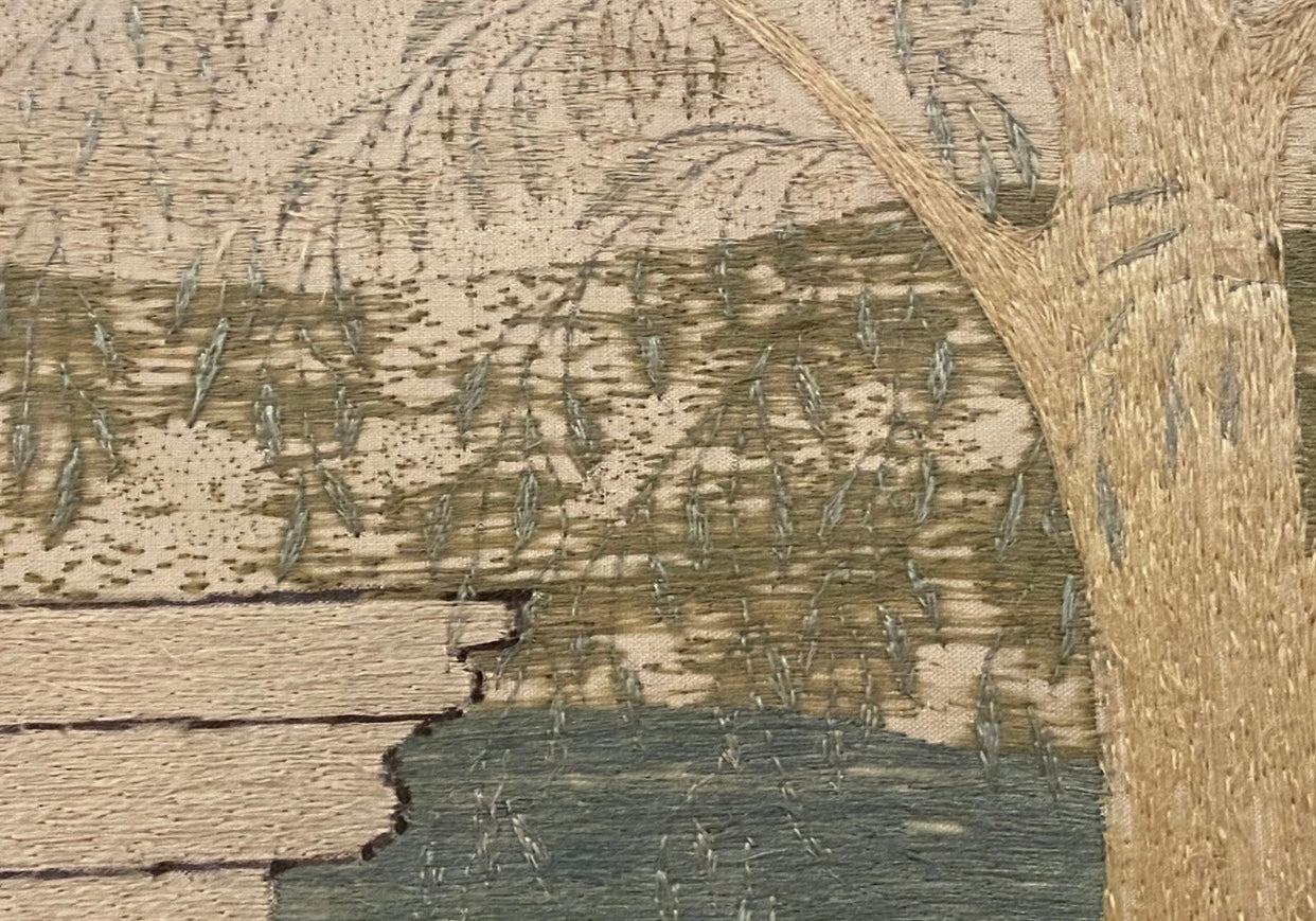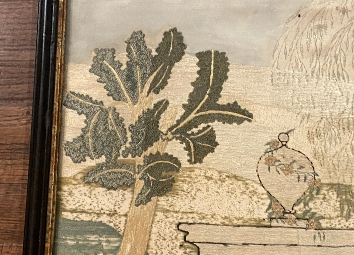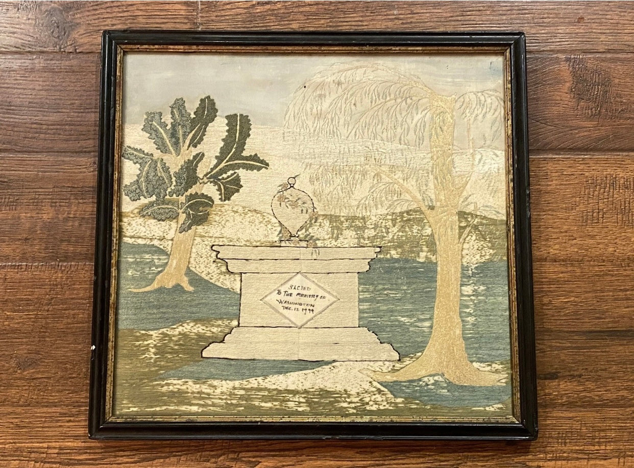 Antique 19th century Silk Embroidered sampler with Memorial To George Washington. Shows tomb with an urn “Sacred to the memory of Washington Dec. 12 1799”. Looks to be in very nice condition for its age. Retains a granny note on the back. The frame measures 14” by 14 5/8”.