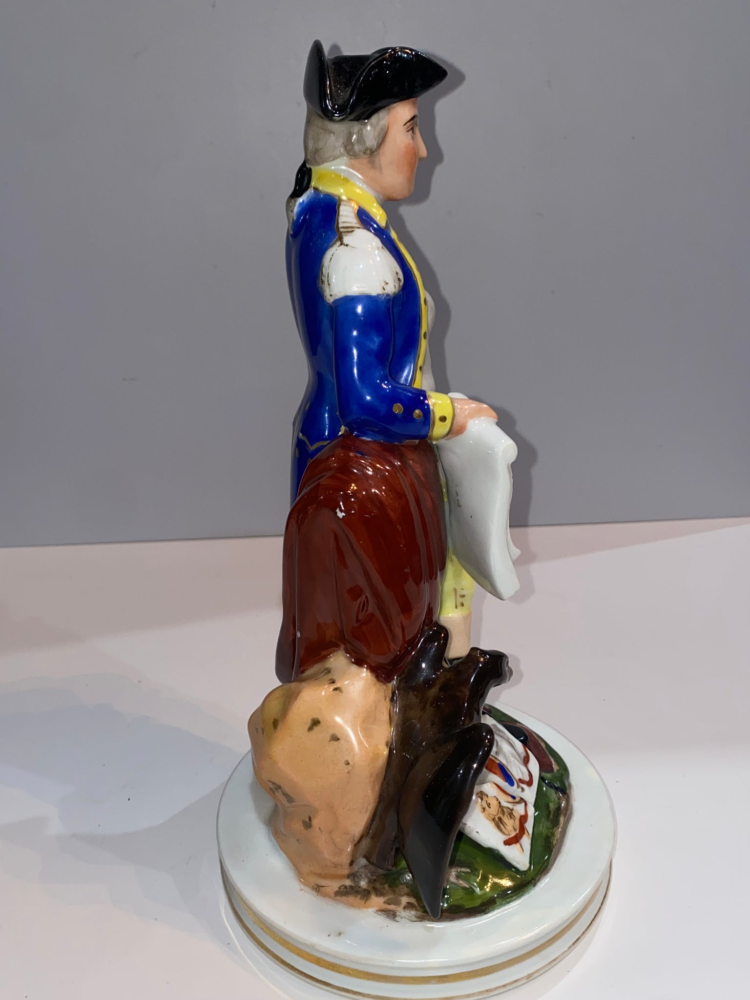 Gilt and Polychrome Decorated Porcelain Statue of George Washington. Attributed to Jacob Petit, Paris, made for the American Market. Based on the 1780 engraving by Noel ale Mire after Le Paon and a Charles Wilson Peale. Depicts Washington as Commander in Chief of the Continental Army holding documents identified in gilt scrip as “Pattie” (fatherland), flanked by an eagle behind the shattered British Royal Coat of Arms displaying the crown, the lion and the unicorn. Base measures 6” in diameter and he stands 11 1/4” tall. Dates circa 1845. Excellent condition with no repairs.