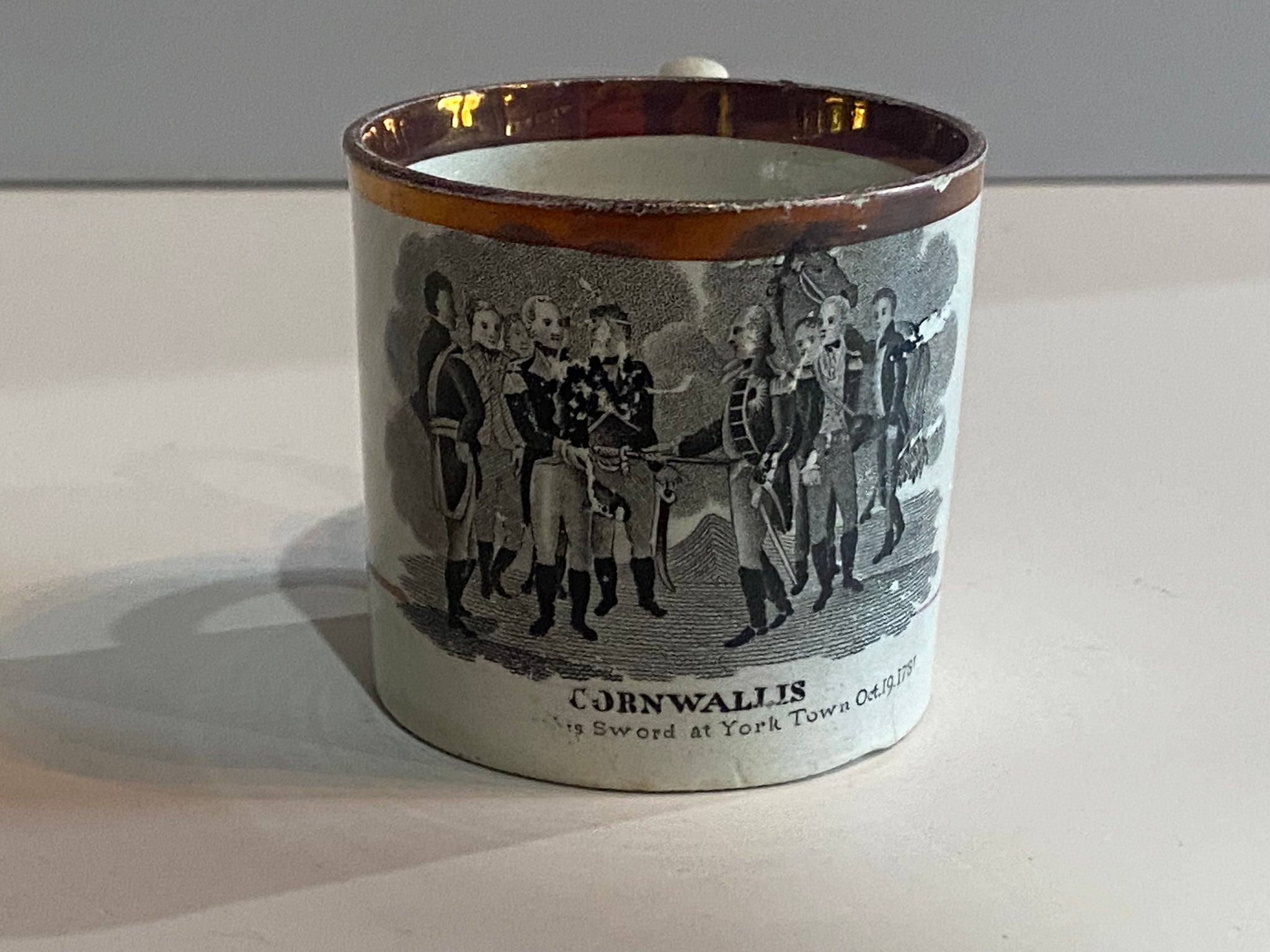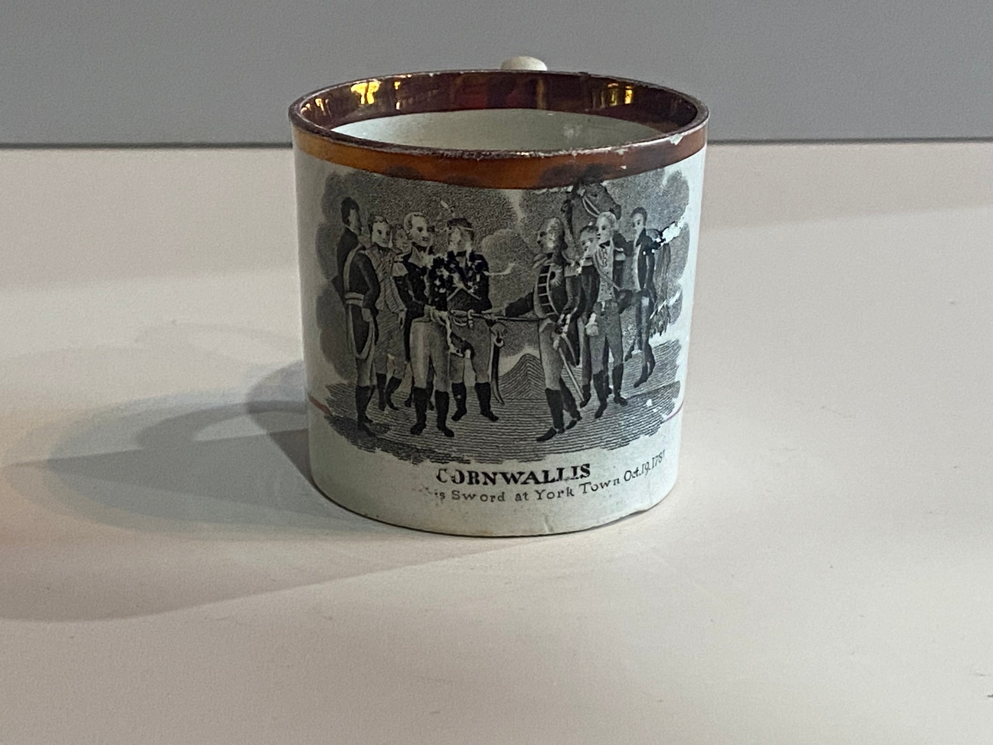 Historical Staffordshire Childrens mug with view of “Cornwallis Surrendering His Sword At Yorktown”. In great condition with just a few tiny glaze wear spots on the rim. Otherwise perfect, no repairs. It measures 2” tall by 2 1/8” in diameter and dates circa 1820’s.
