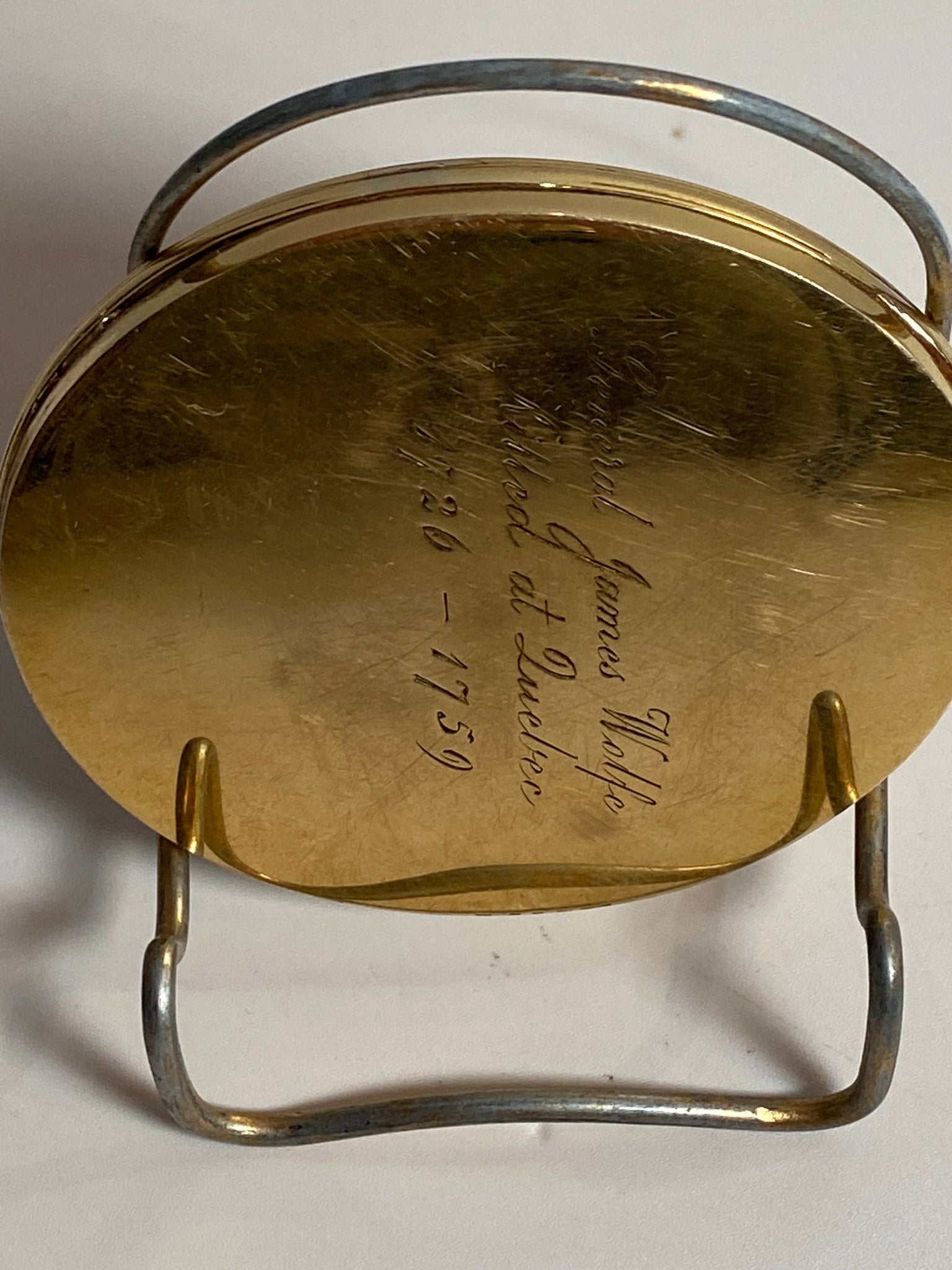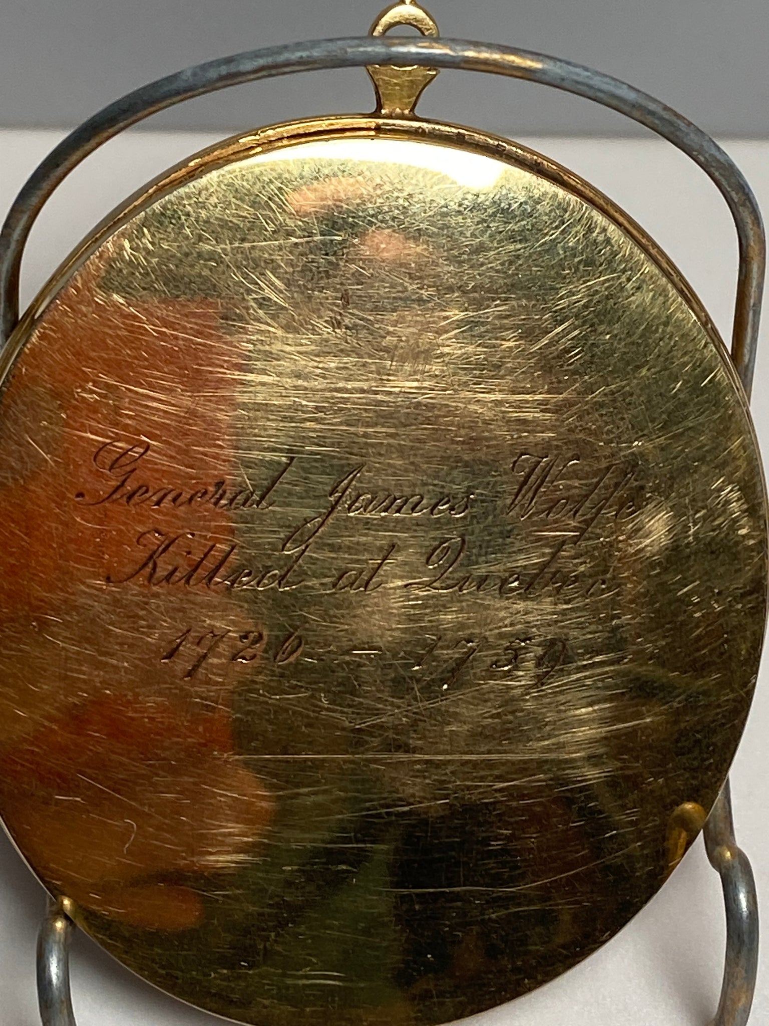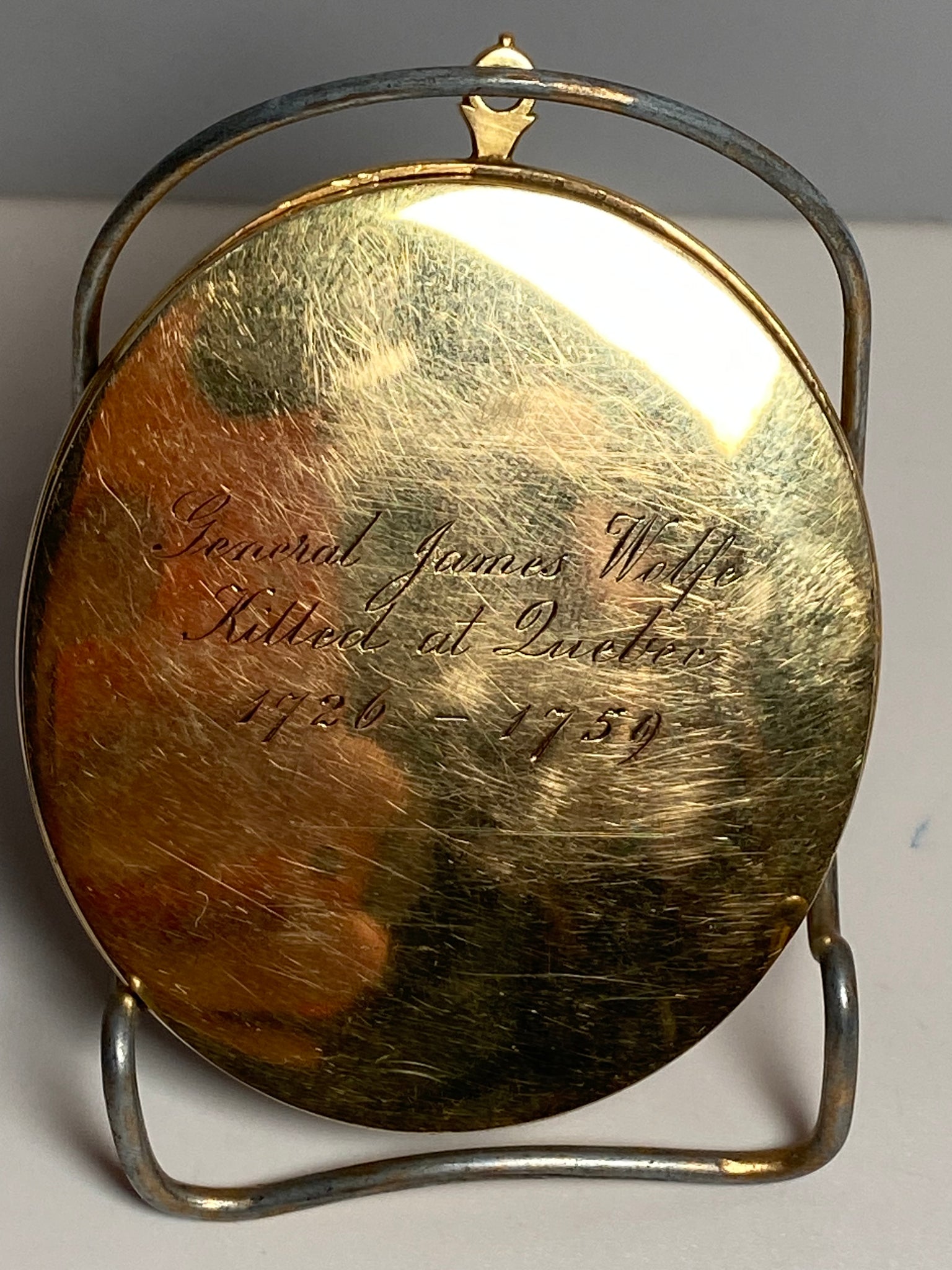 Incredibly well detailed miniature portrait painting of General James Wolfe. Most likely on ivory and cases in a gold case. Inscribed on the back “ General James Wolfe - Killed at Quebec 1726 - 1759. Most likely dates to the late 18th early 19th century. It measures 2” by 2 1/2”.
